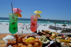 Dine at Angler’s Beachside Bar & Grill on Okaloosa Island with fresh seafood, Gulf views, pier access, Sunday brunch, and family-friendly beachfront vibes in Fort Walton Beach.