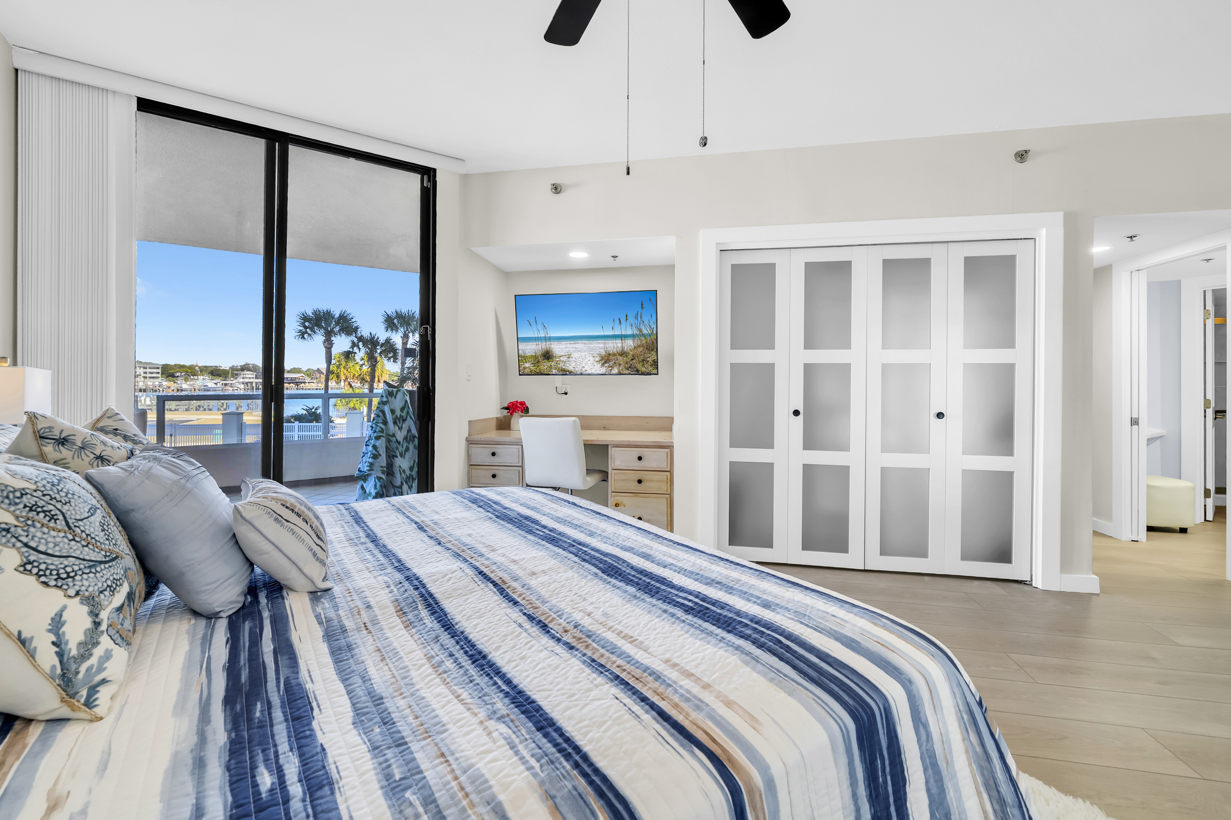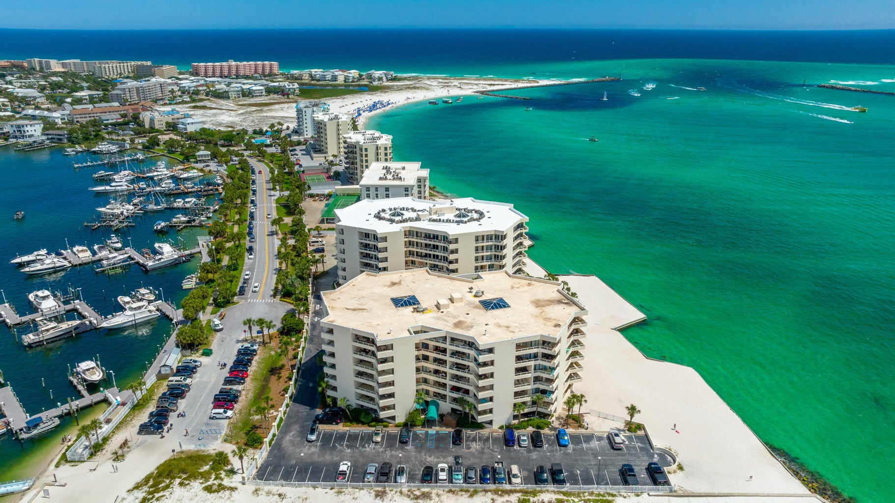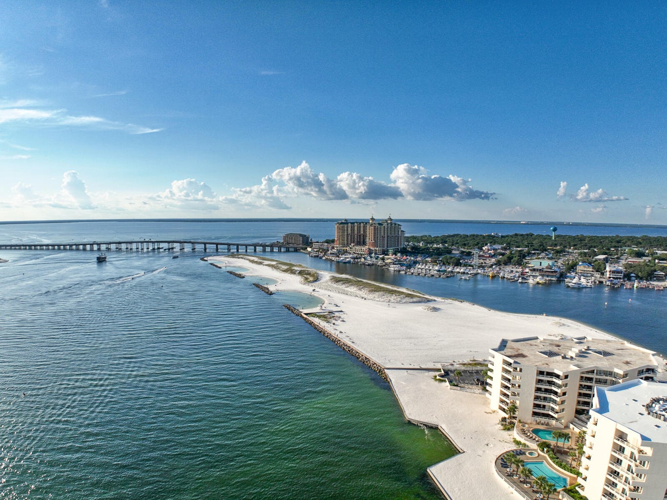 Guests at East Pass Towers enjoy an exceptional collection of resort style amenities, including a waterfront swimming pool, hot tub, private sandy beach along the jetties, fitness center, and free parking within the gated community. Exclusive access to the Norriego Point recreation area makes beach days and water taxi rides to HarborWalk Village restaurants, shops, and entertainment both easy and memorable. Whether you are boating, beach hopping, or simply relaxing while taking in the ever changing harbor activity, Emerald Breeze delivers a peaceful yet connected Destin getaway you will want to return to year after year.