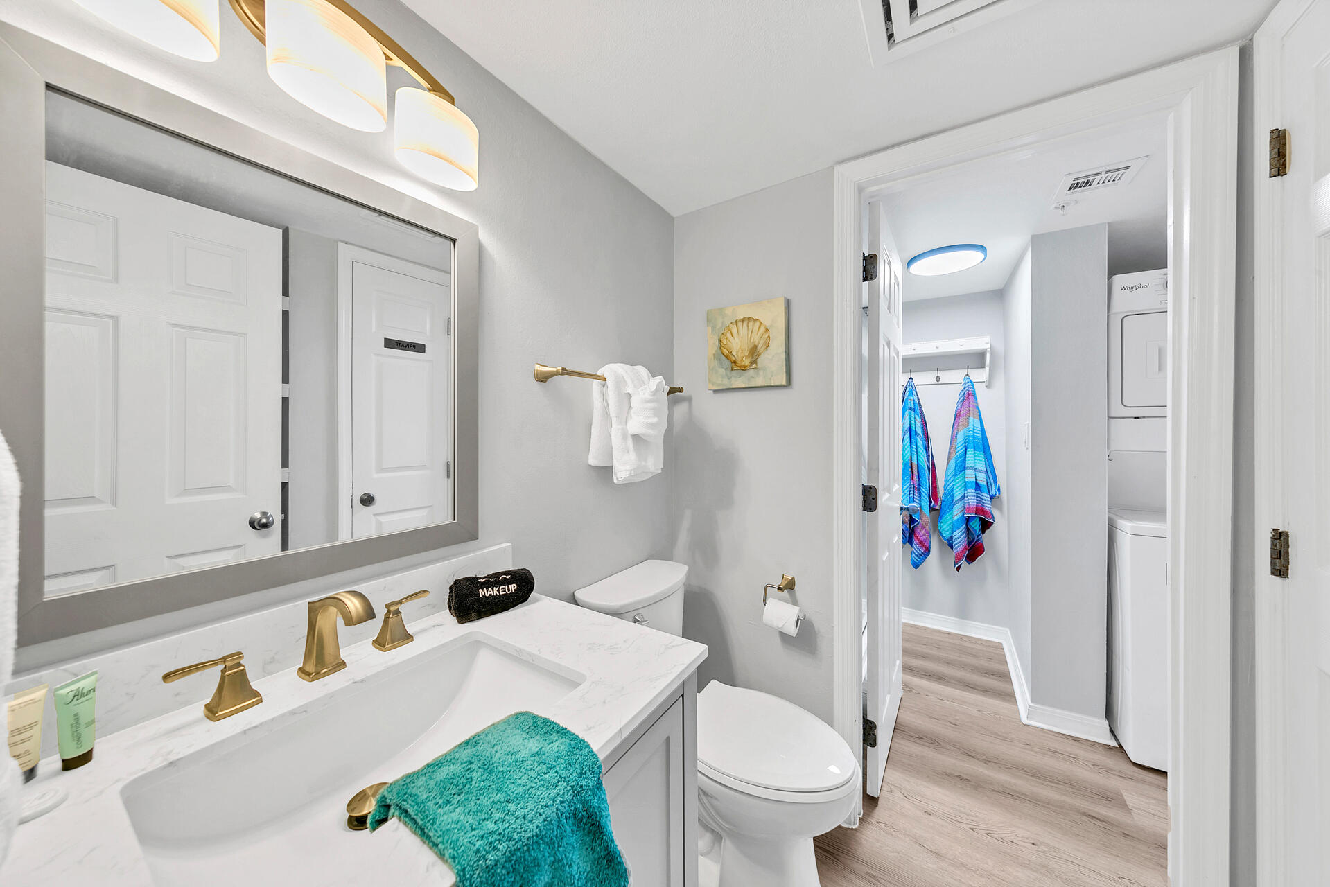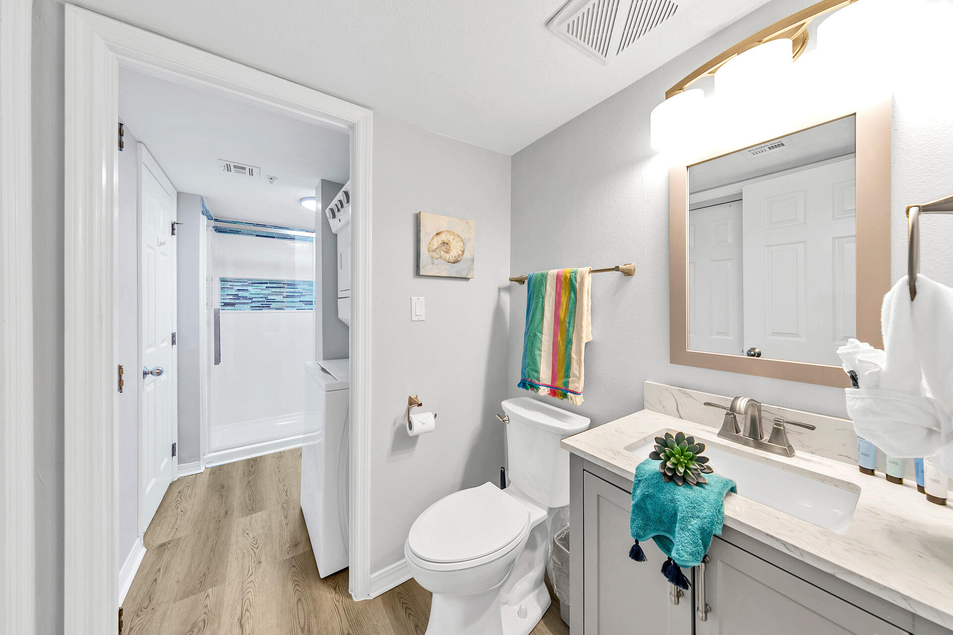 "My mom and I had a wonderful stay. We loved the balcony. The place is newly redone and super cute. The layout is two sink areas and two toilets and one shower. The kitchen is stocked but definitely a “butt bumper” for 2 people. We just took turns. 🙂 Plenty of seating! It’s also a very easy walk to the beach and the chairs included are awesome. We hope to be back."