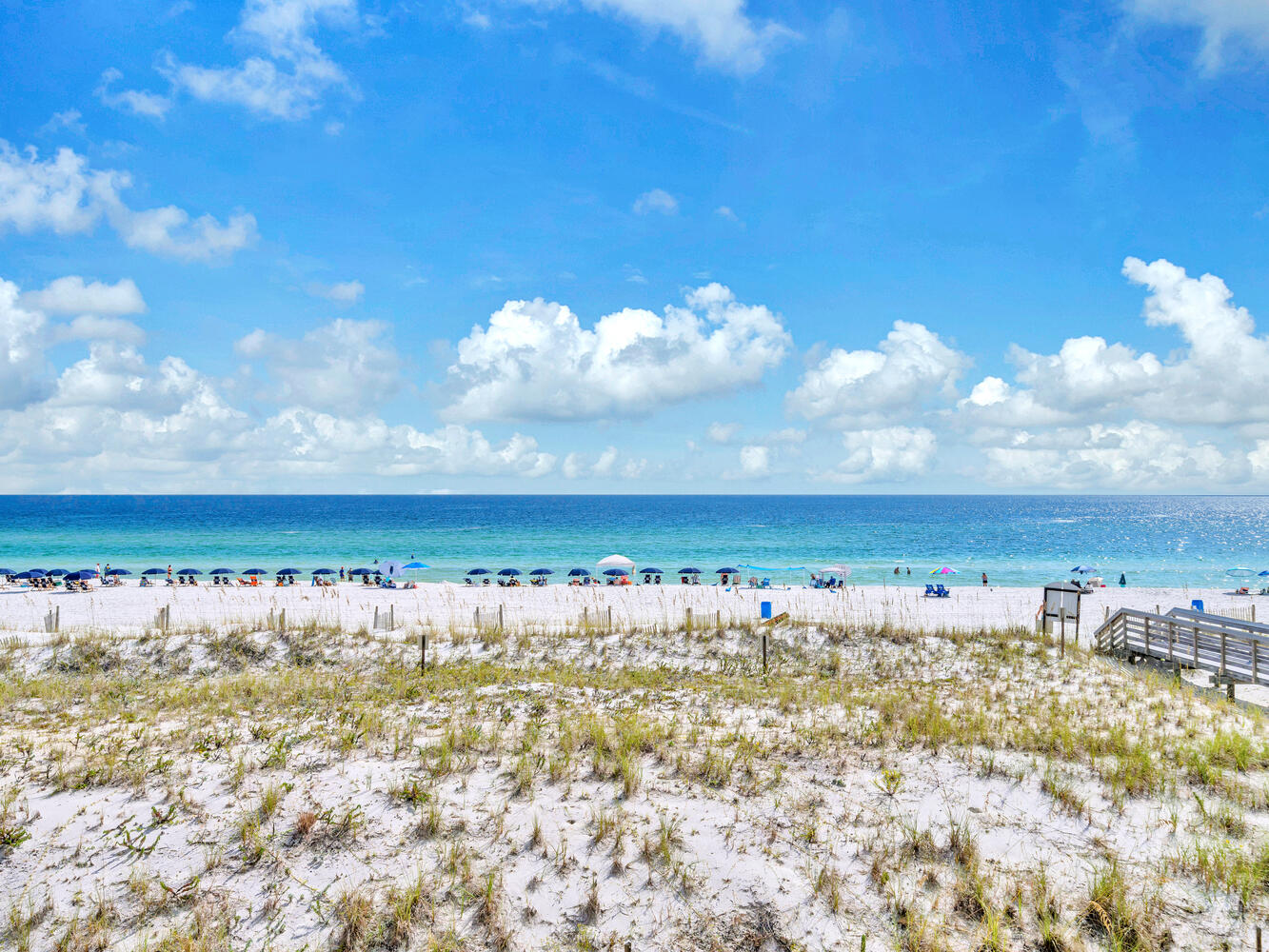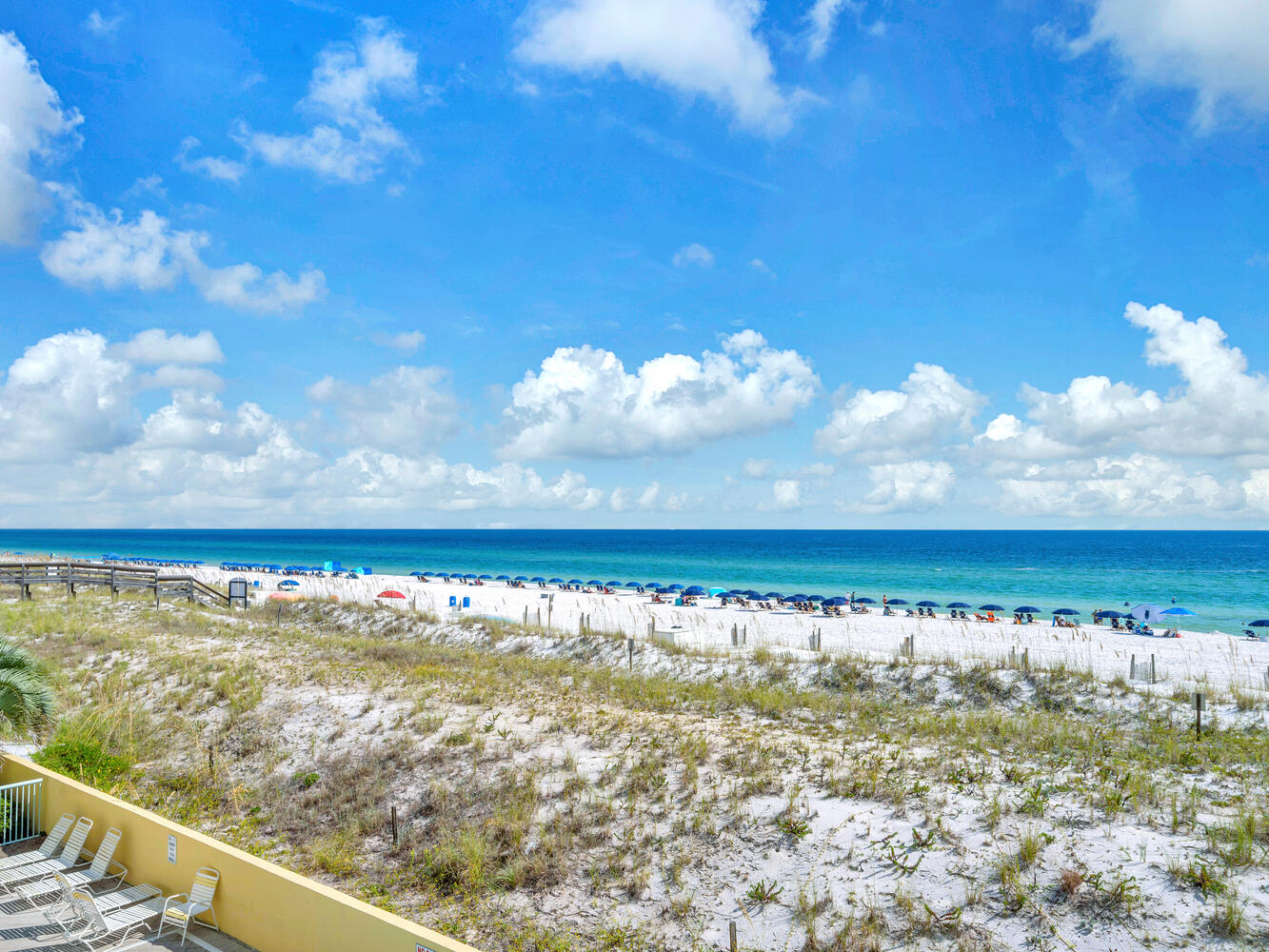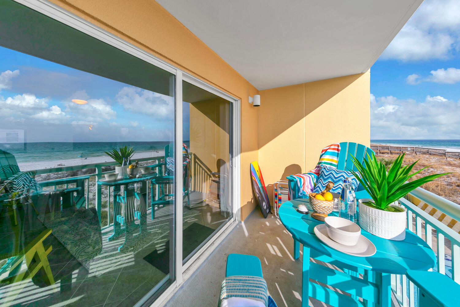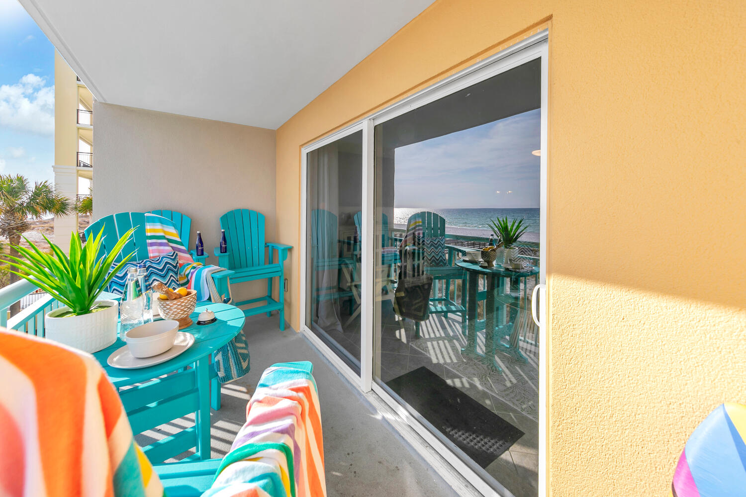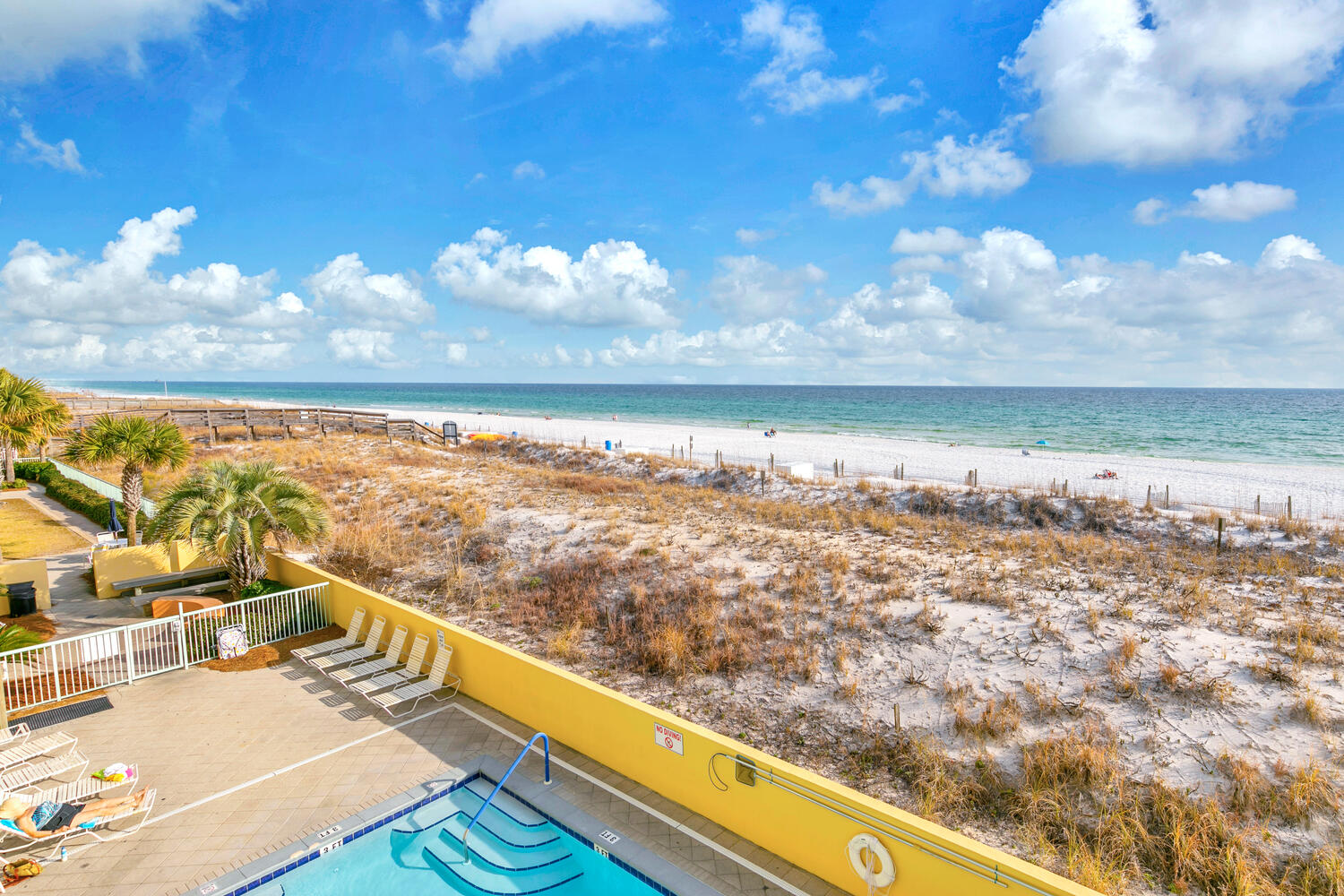 "Priceless view from the balcony!! Beautiful ocean view overlooking the pool. Saw dolphins several times! Sat on the balcony & could easily keep an eye on our 2 older teenagers while they swam in the pool or used the hot tub. Thankful condo is on the 2nd floor. Easily walked up & down the steps to get to the very close beach access if we didn’t want to use the elevator. It was decorated beautifully just like the pictures! Loved the colors & decorations! It was very important to me that it was clean & spotless! Totally updated! We stayed a full week & had clean clothes & fresh dry towels thanks to the full sized washer & dryer! Couldn’t have lived without them!