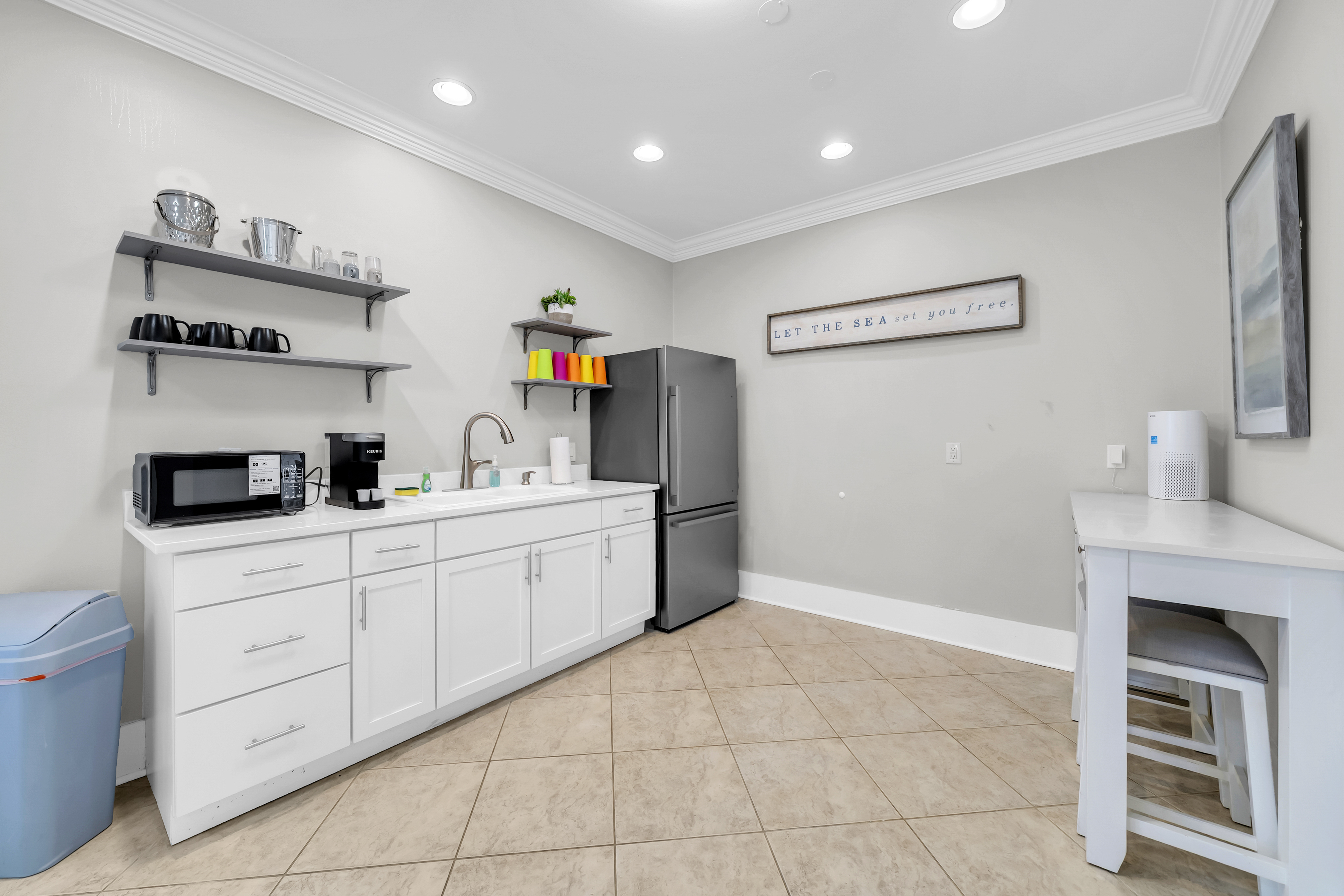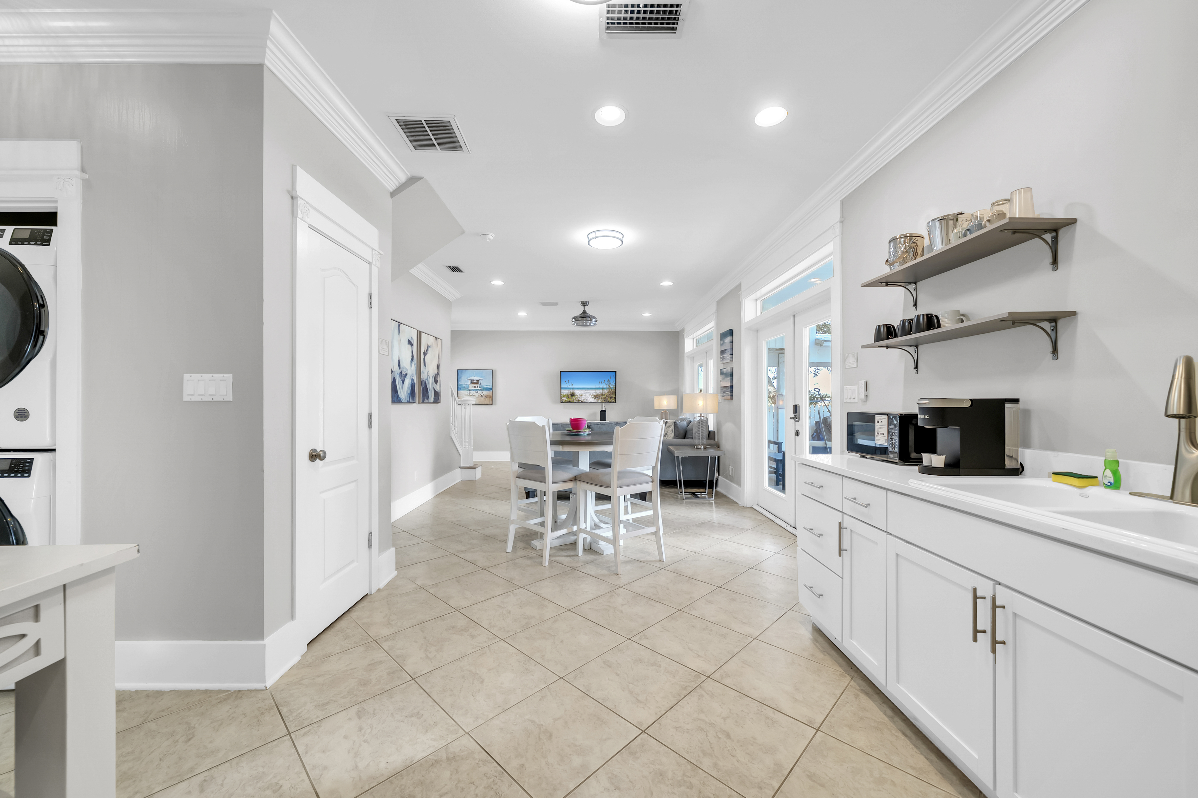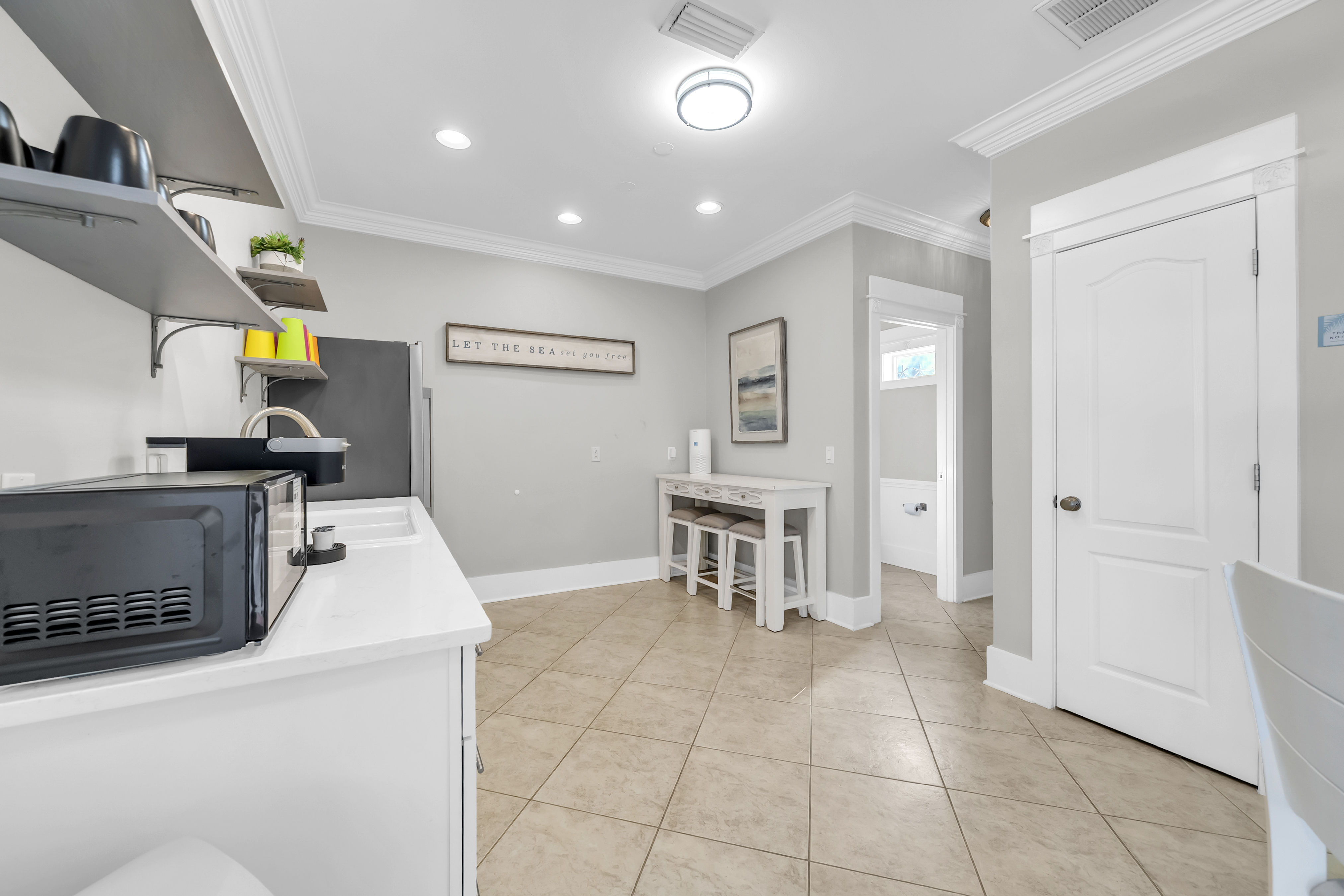 The carriage house is tucked behind the main home just beyond the pool patio, offering a private and comfortable retreat. It features a convenient kitchenette complete with a Keurig, perfect for easy coffee mornings or light refreshments.