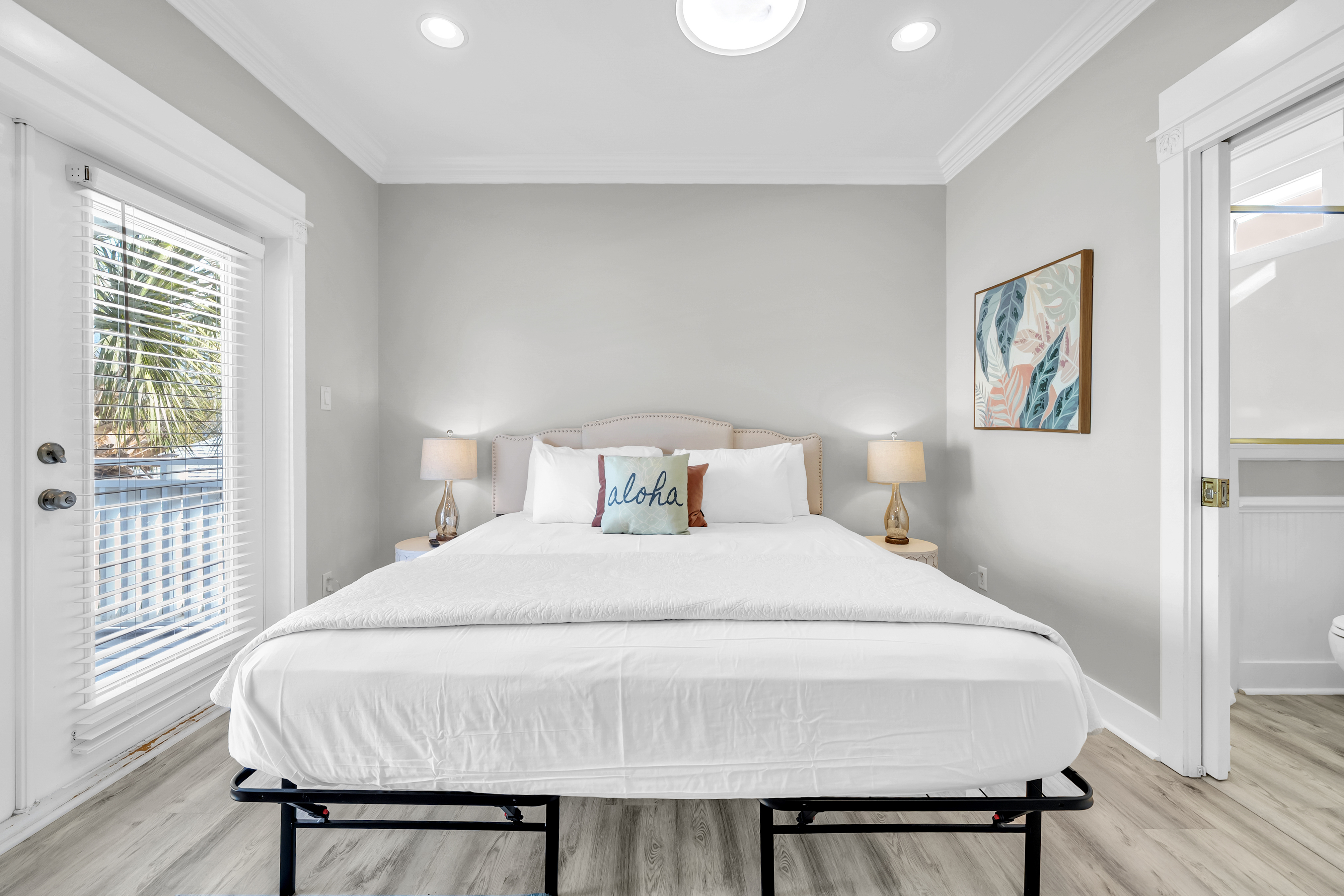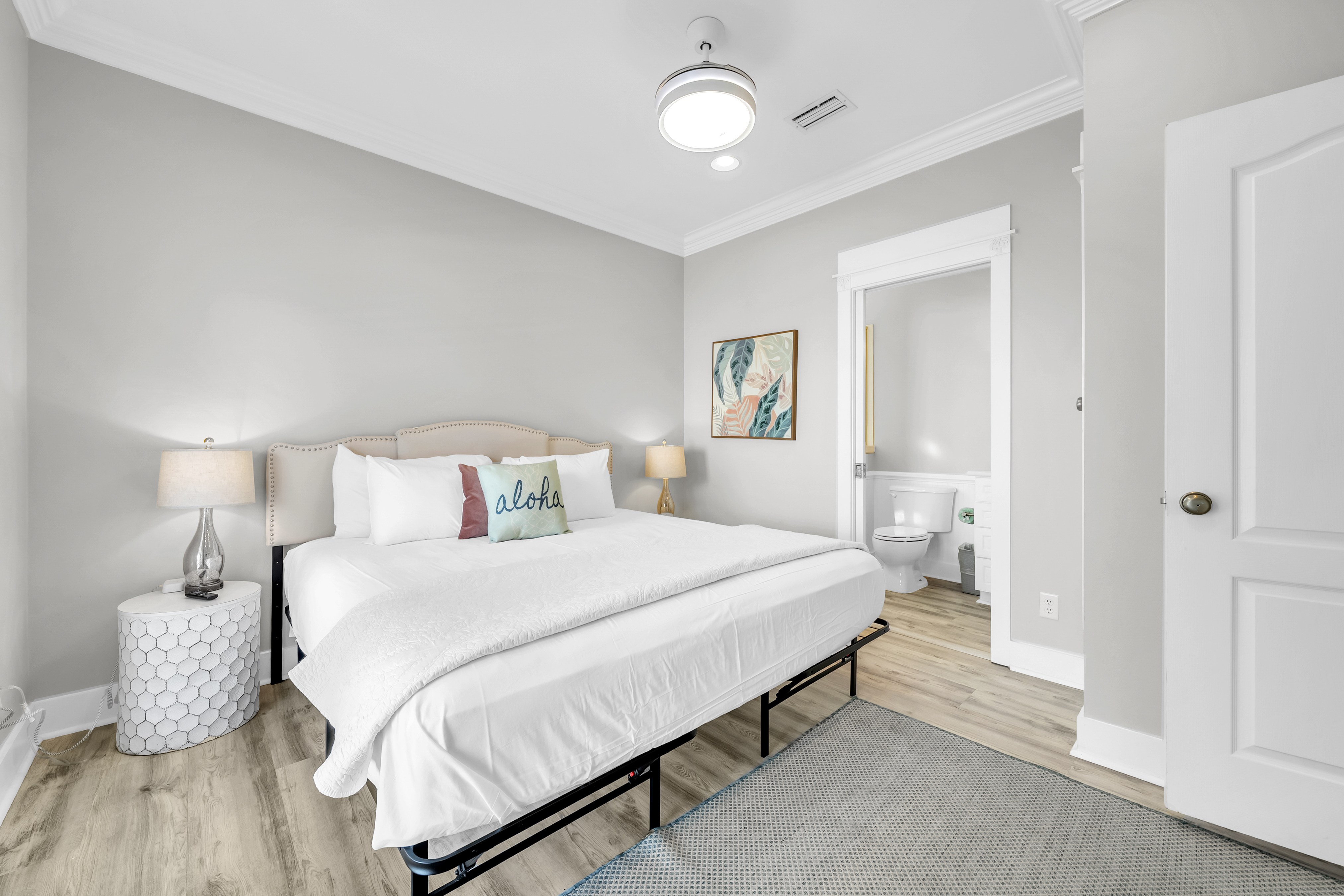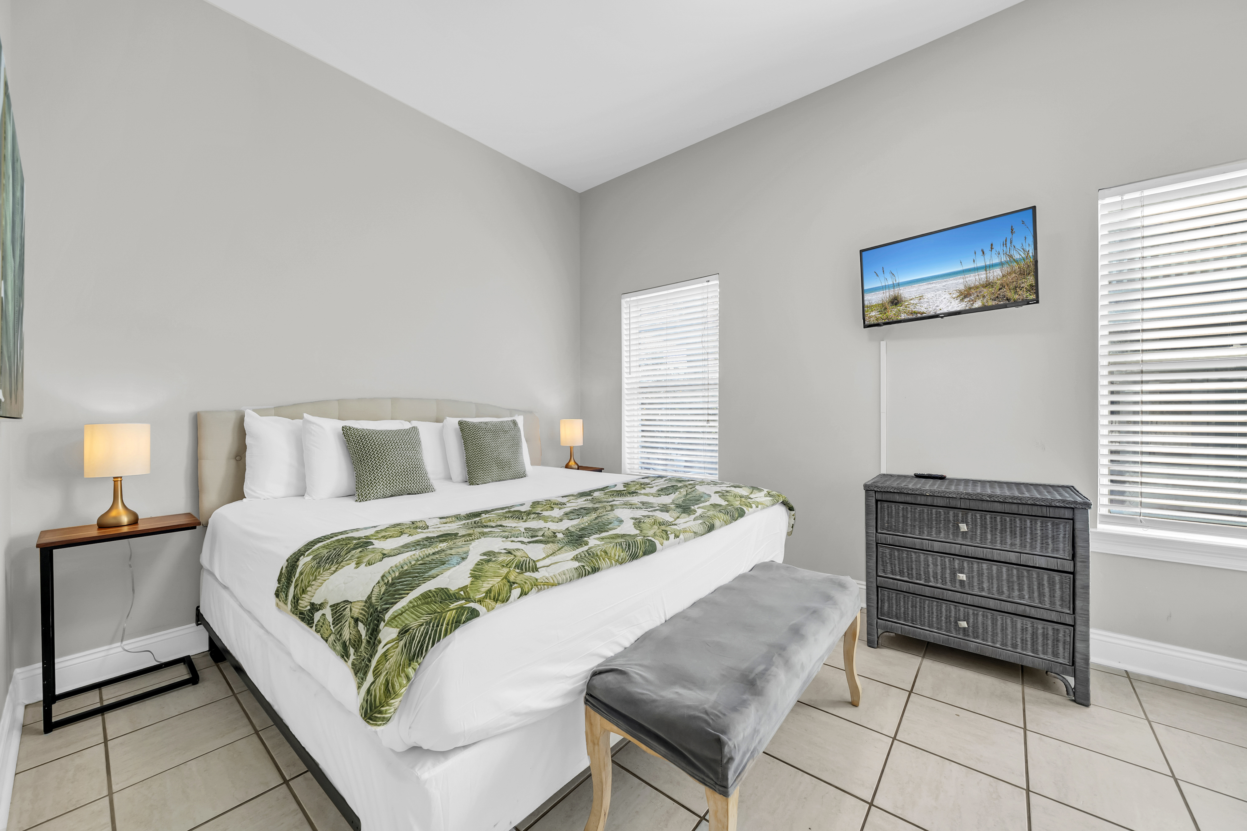 Guest Bedroom #1: This bedroom includes a king-sized bed, 2 nightstands, a dresser, and mounted flat-screen TV. There is a private bathroom attached with a single vanity and walk-in shower.