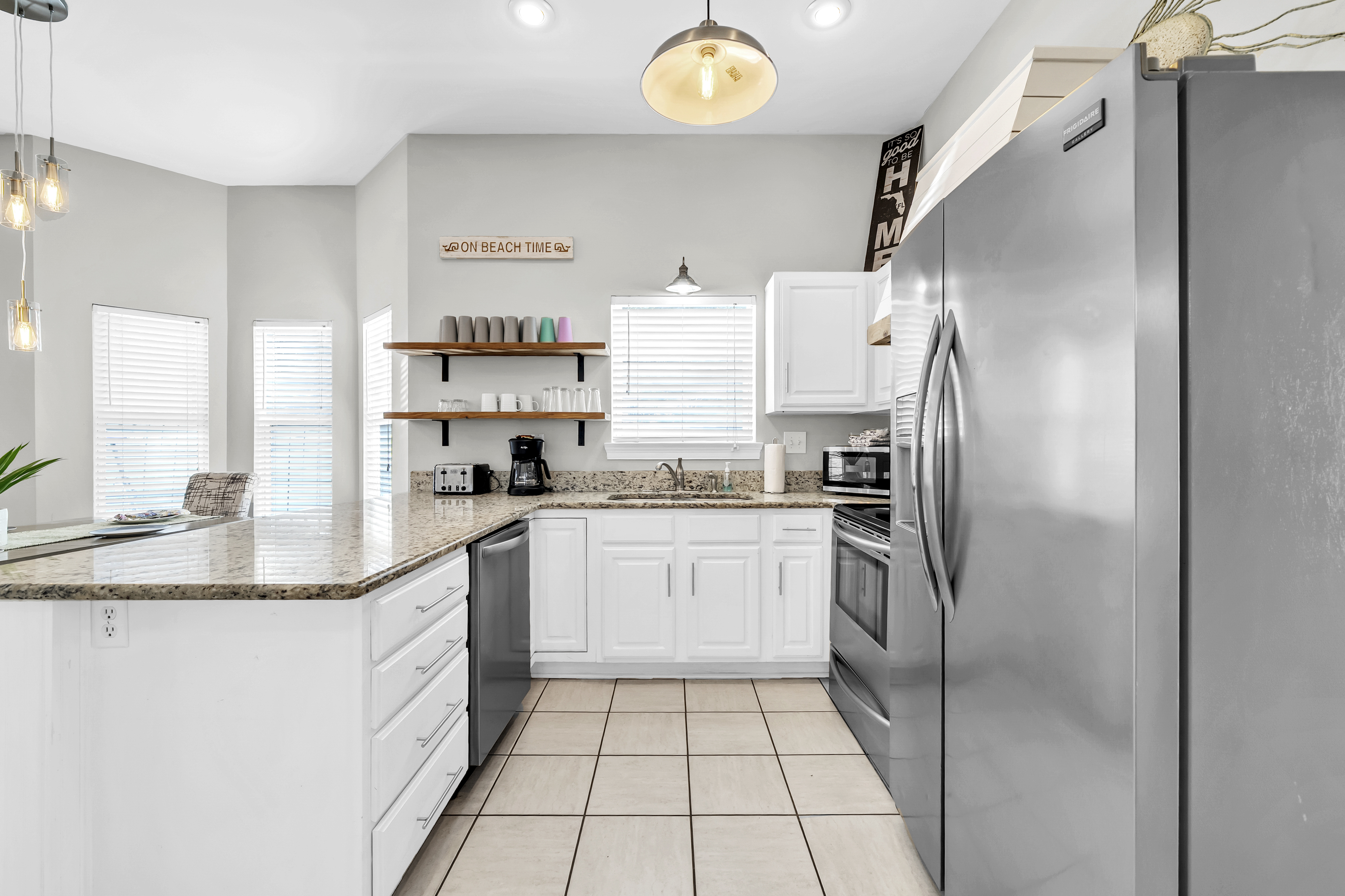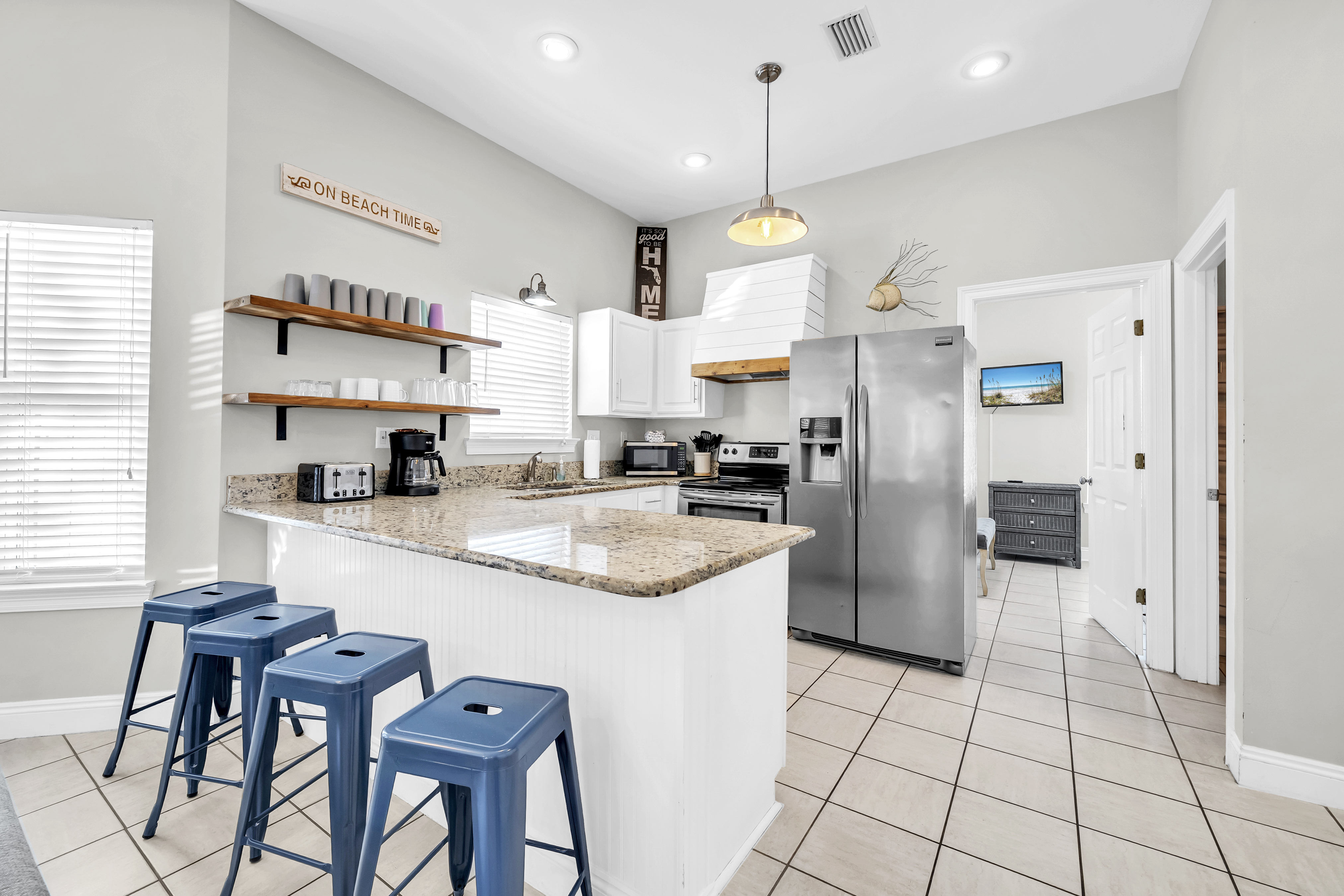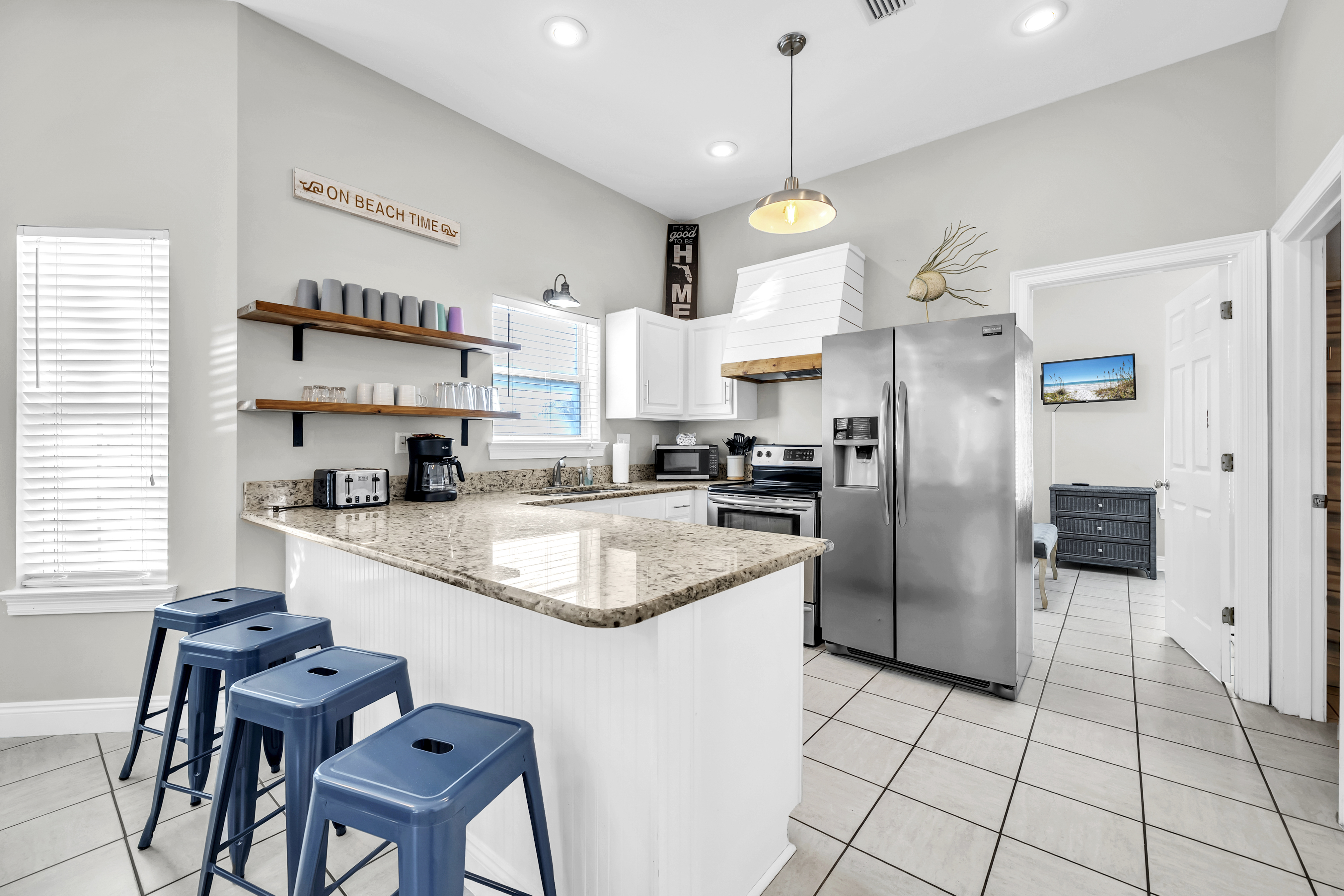 Kitchen: This spacious kitchen is fully stocked for preparing meals with family and friends. It features polished cabinetry and stainless steel appliances throughout. Amenities include a microwave, dishwasher, refrigerator, toaster, and Keurig, along with all standard utensils and cookware. There is additional seating at the breakfast bar.