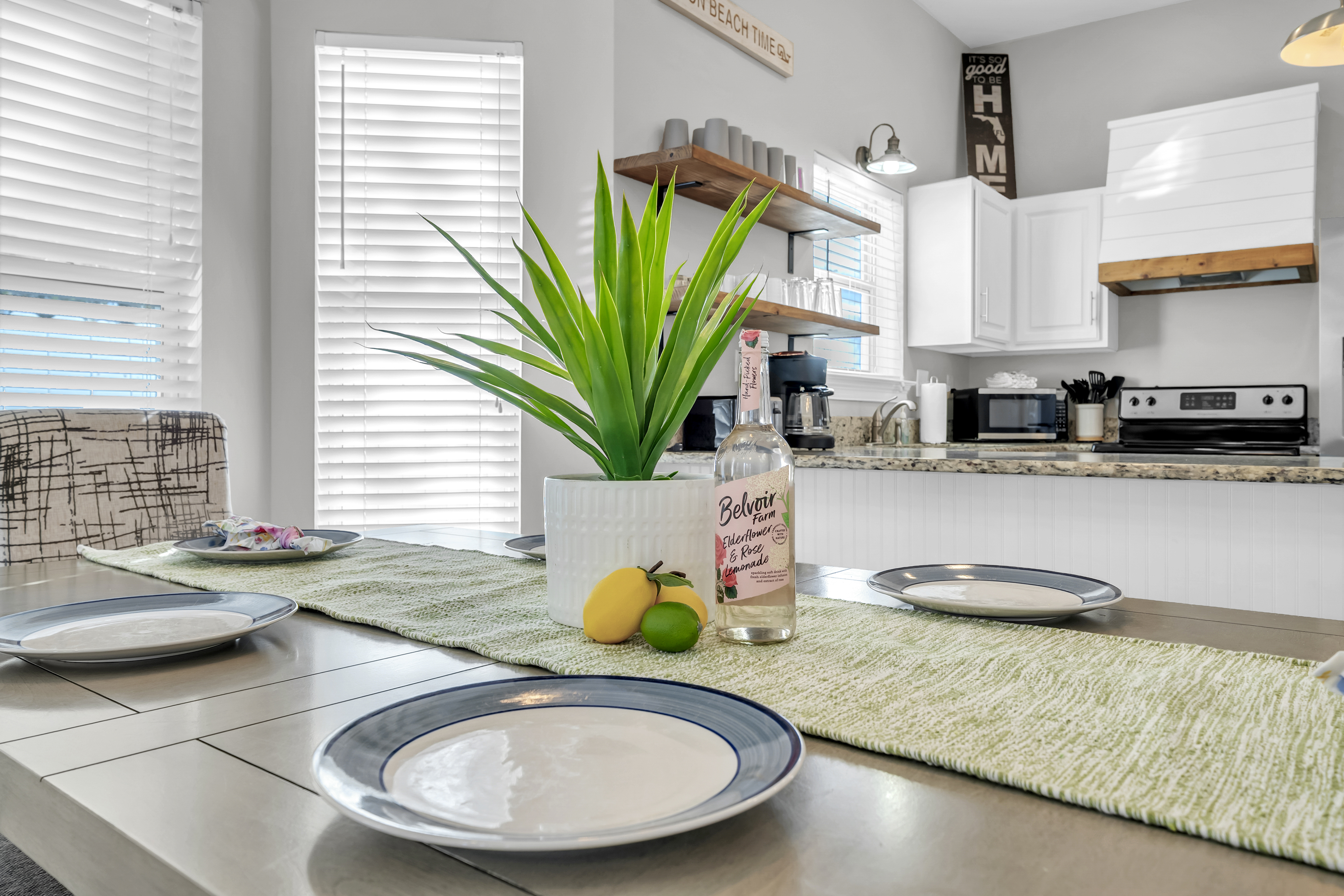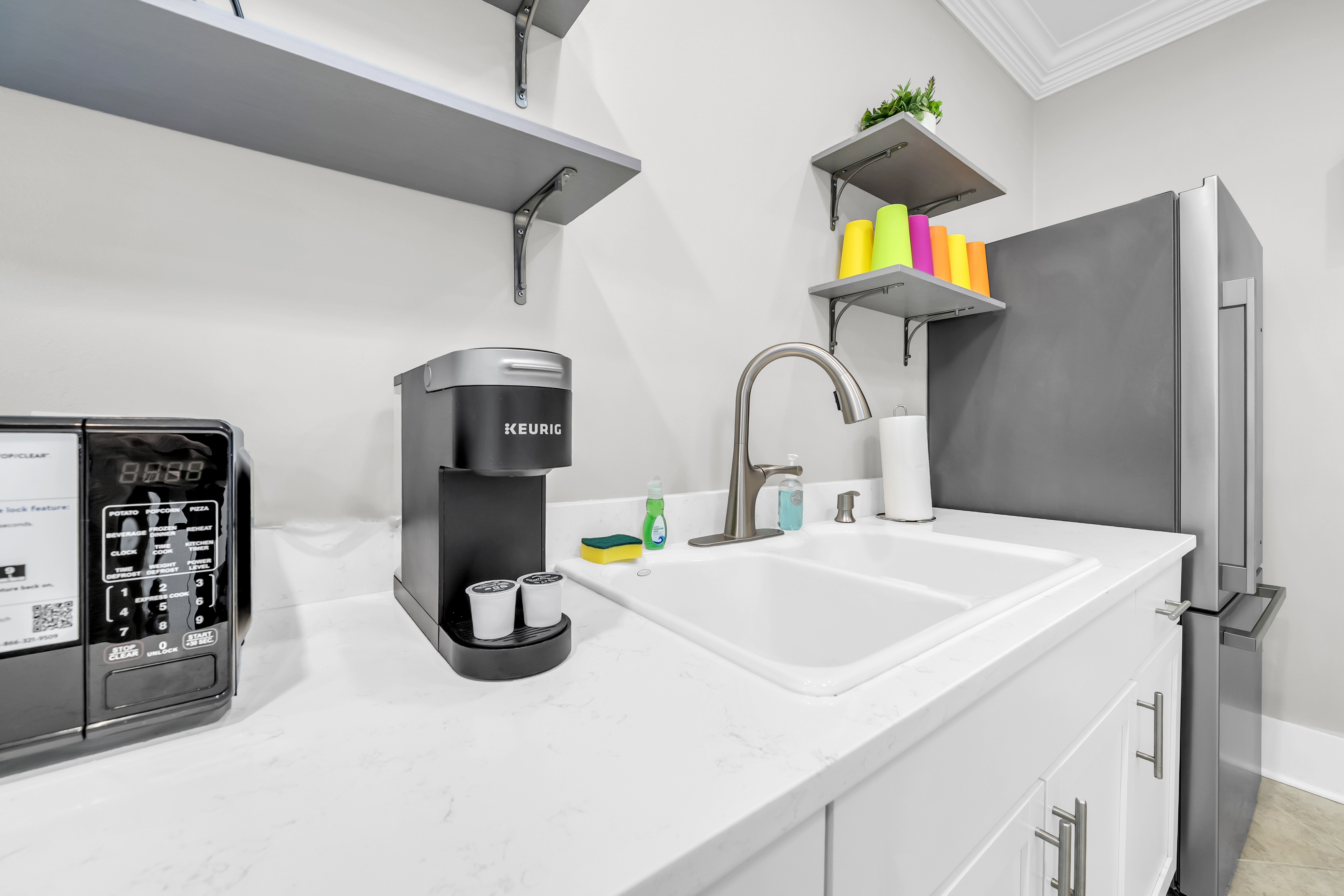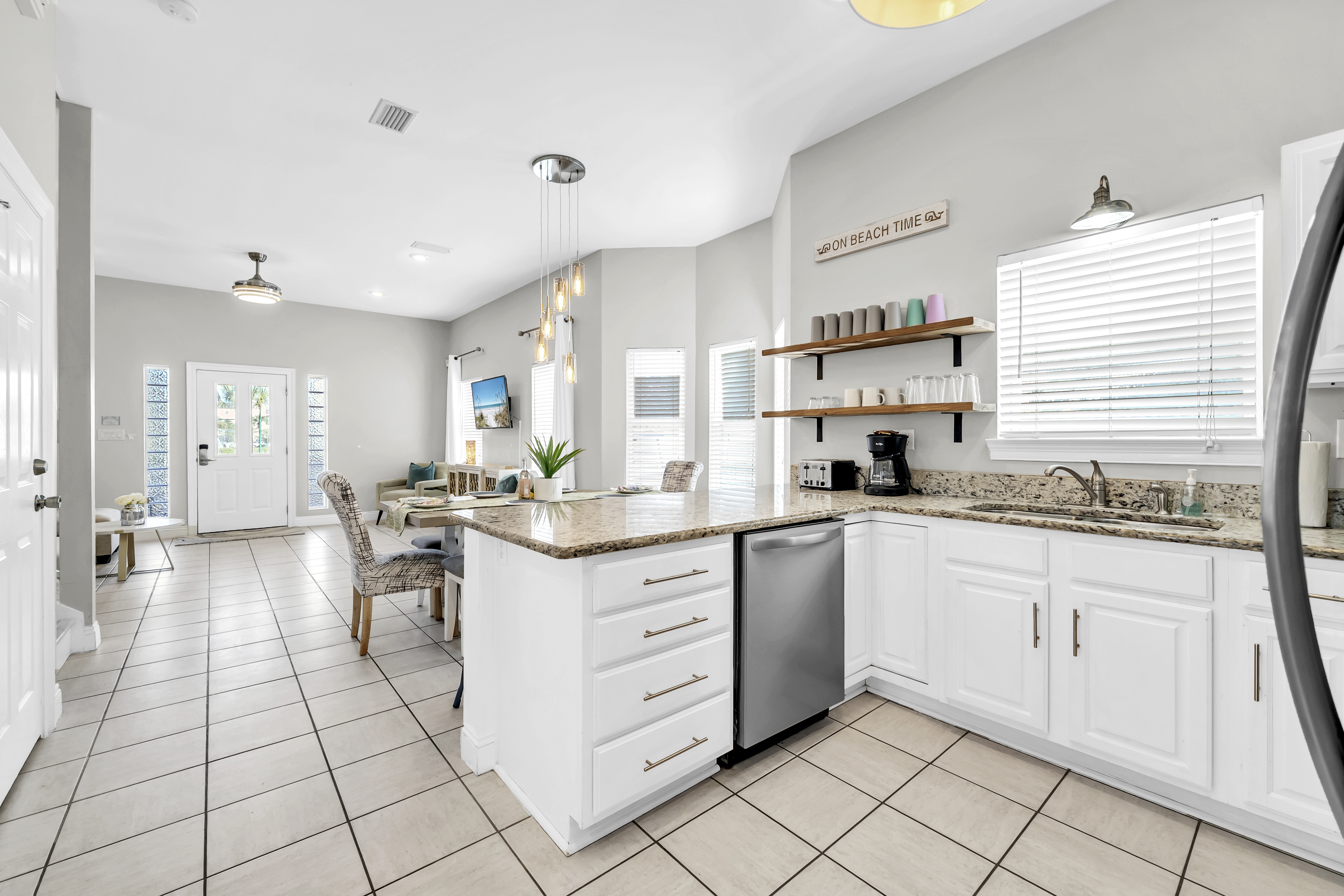Kitchen: This spacious kitchen is fully stocked for preparing meals with family and friends. It features polished cabinetry and stainless steel appliances throughout. Amenities include a microwave, dishwasher, refrigerator, toaster, and Keurig, along with all standard utensils and cookware. There is additional seating at the breakfast bar.