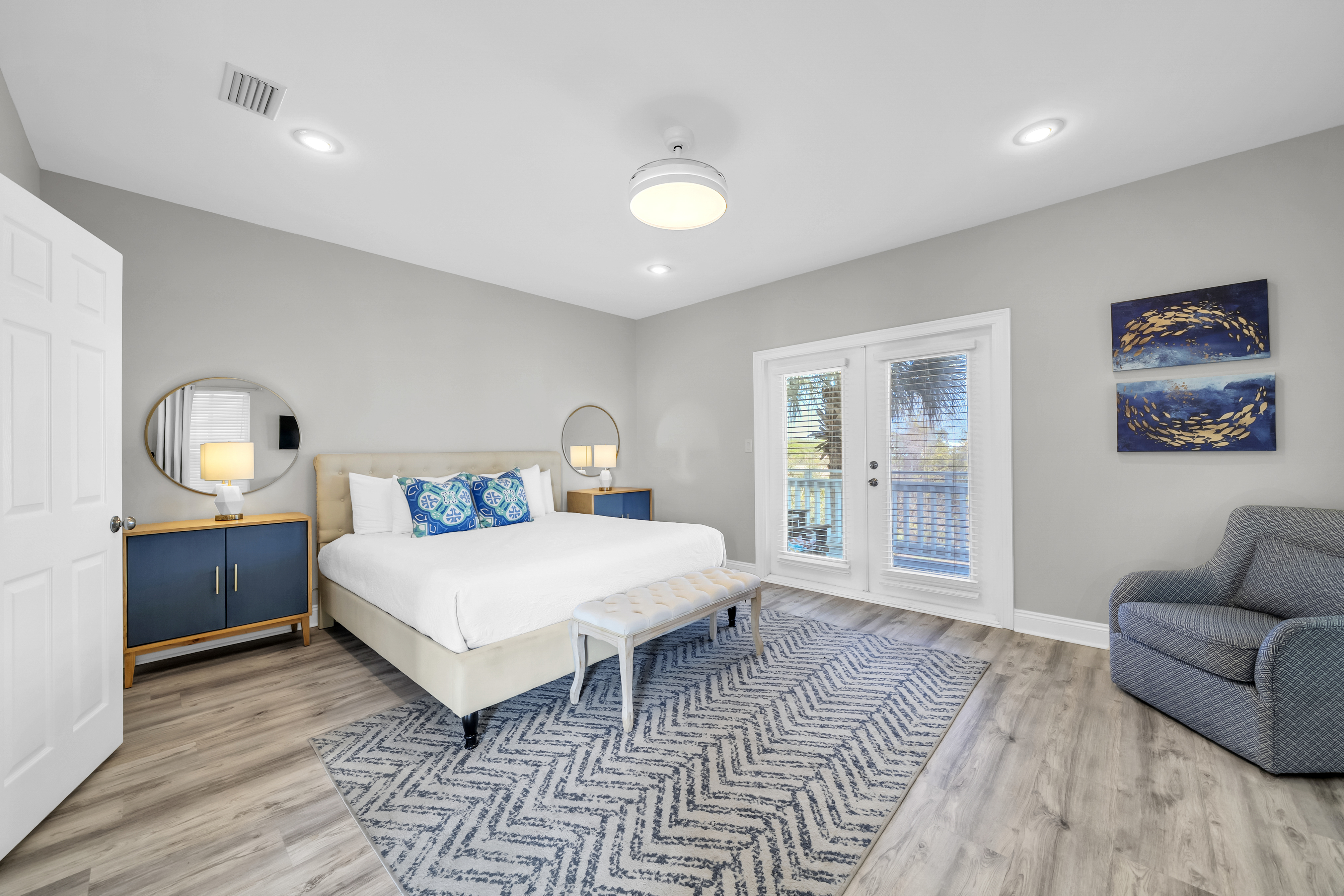 Inside, the home offers bright coastal interiors and an open-concept layout designed for comfort and connection. The main living areas downstairs bring together the living room, kitchen, and dining spaces in an airy setting that feels both open and inviting. Two king suites in the main house provide private retreats for couples or families, while a fun bunk room with its own ensuite bathroom creates a perfect space for kids or younger guests. Just beyond the pool, a separate carriage house adds even more flexibility with two king suites and a convenient kitchenette, creating a comfortable and private hideaway for additional guests.
