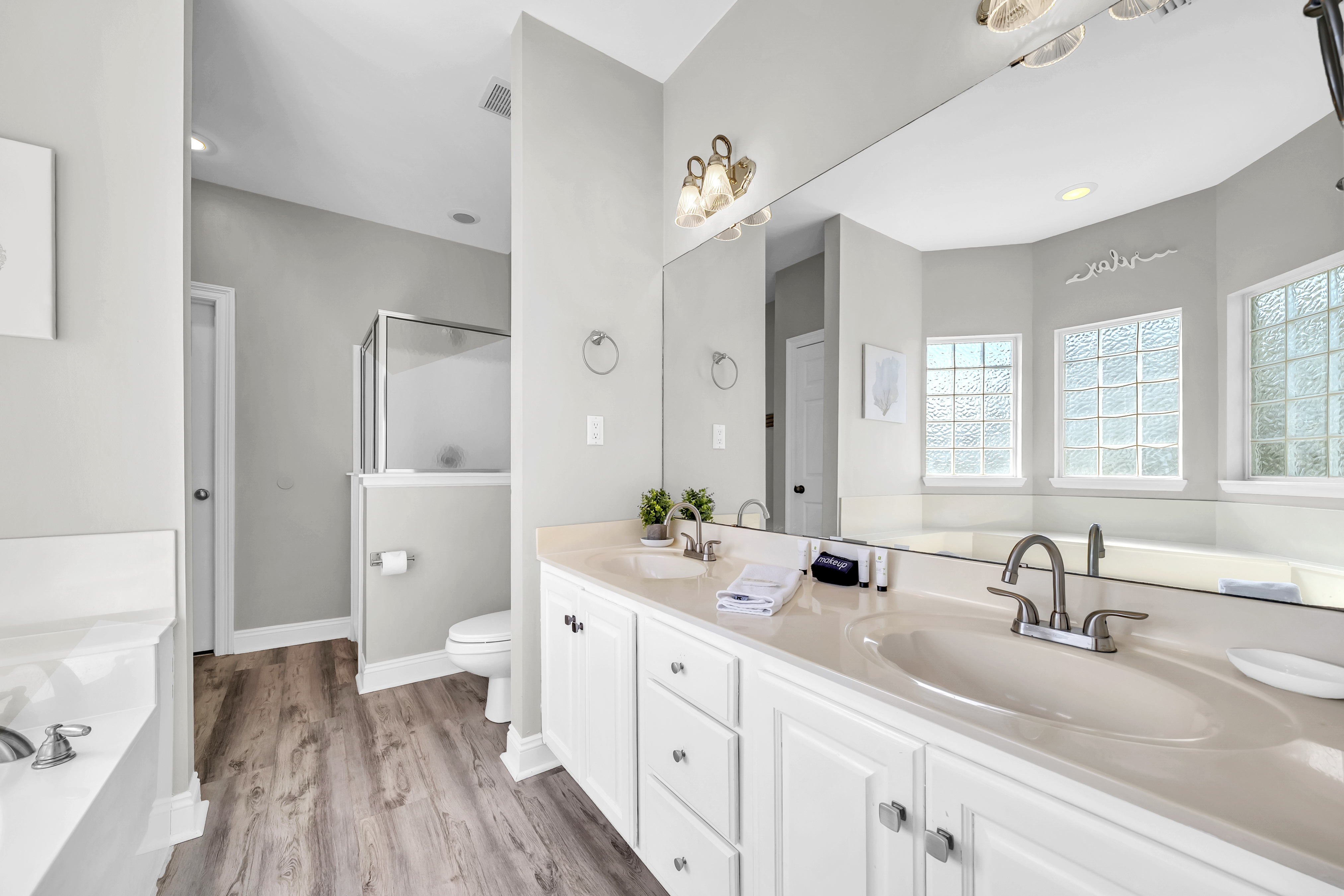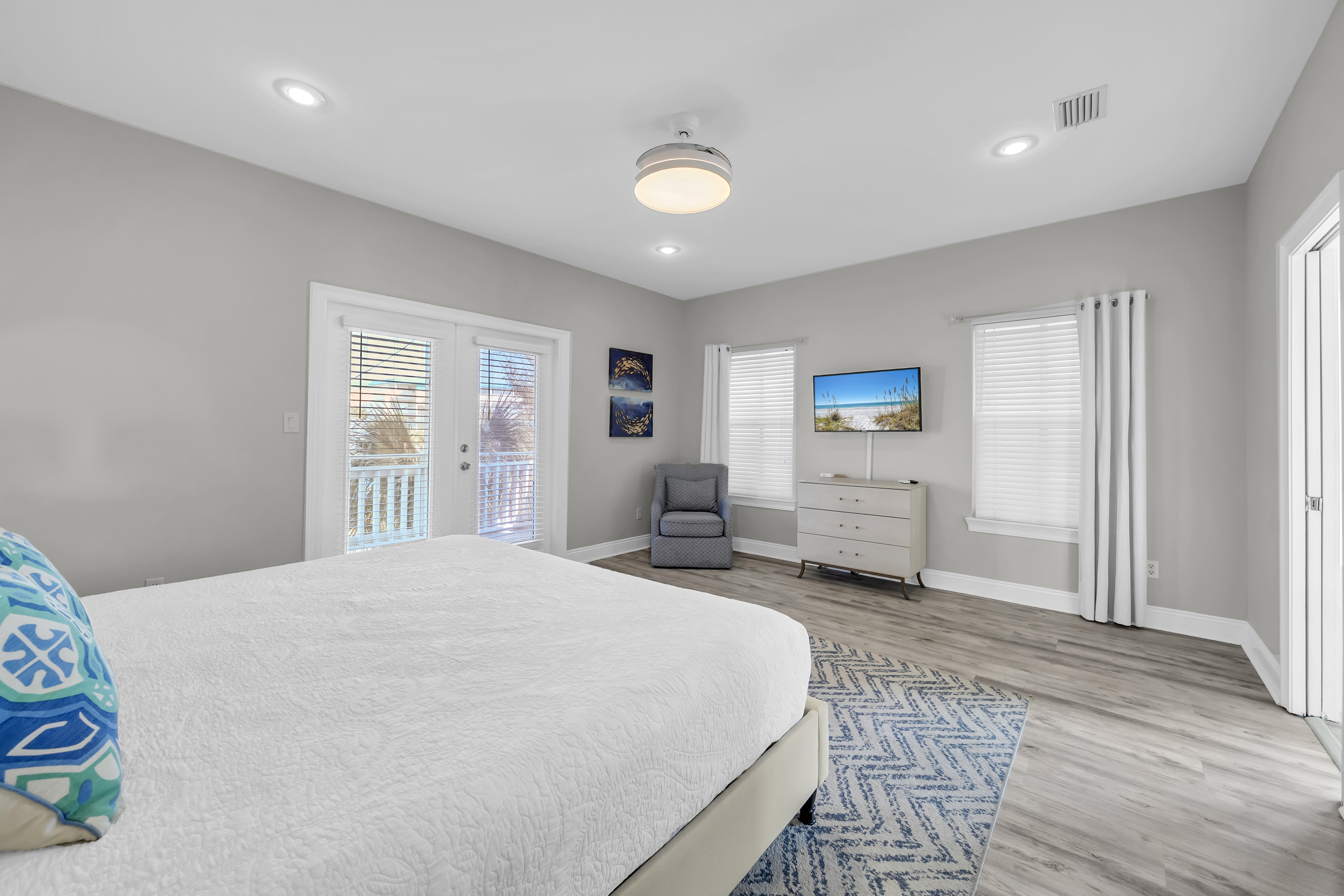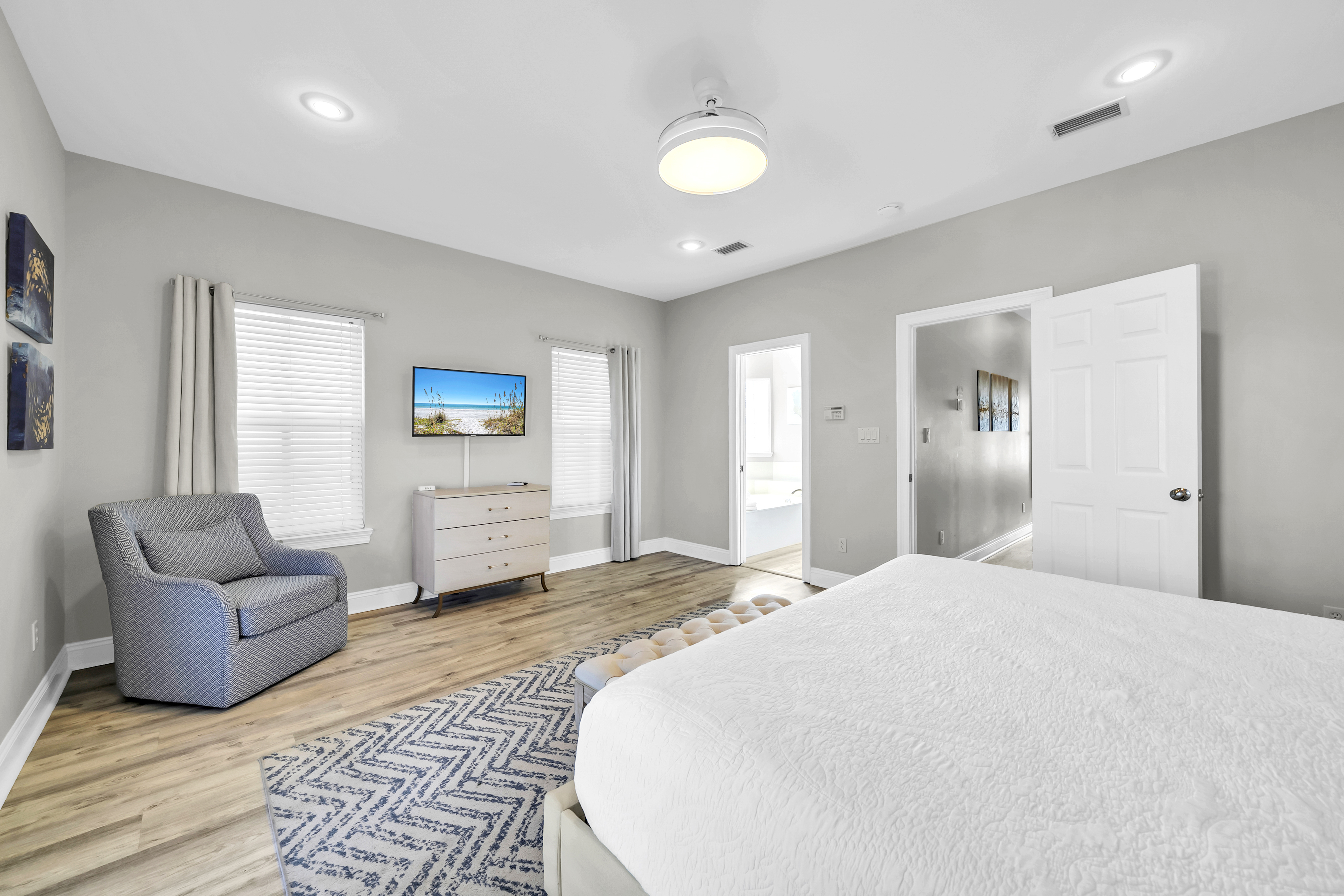 Master Bedroom #2: This bedroom includes a king-sized bed, 2 nightstands, a dresser, and mounted flat-screen TV. There is a private bathroom attached with dual vanities, a walk-in shower, and freestanding bathtub.