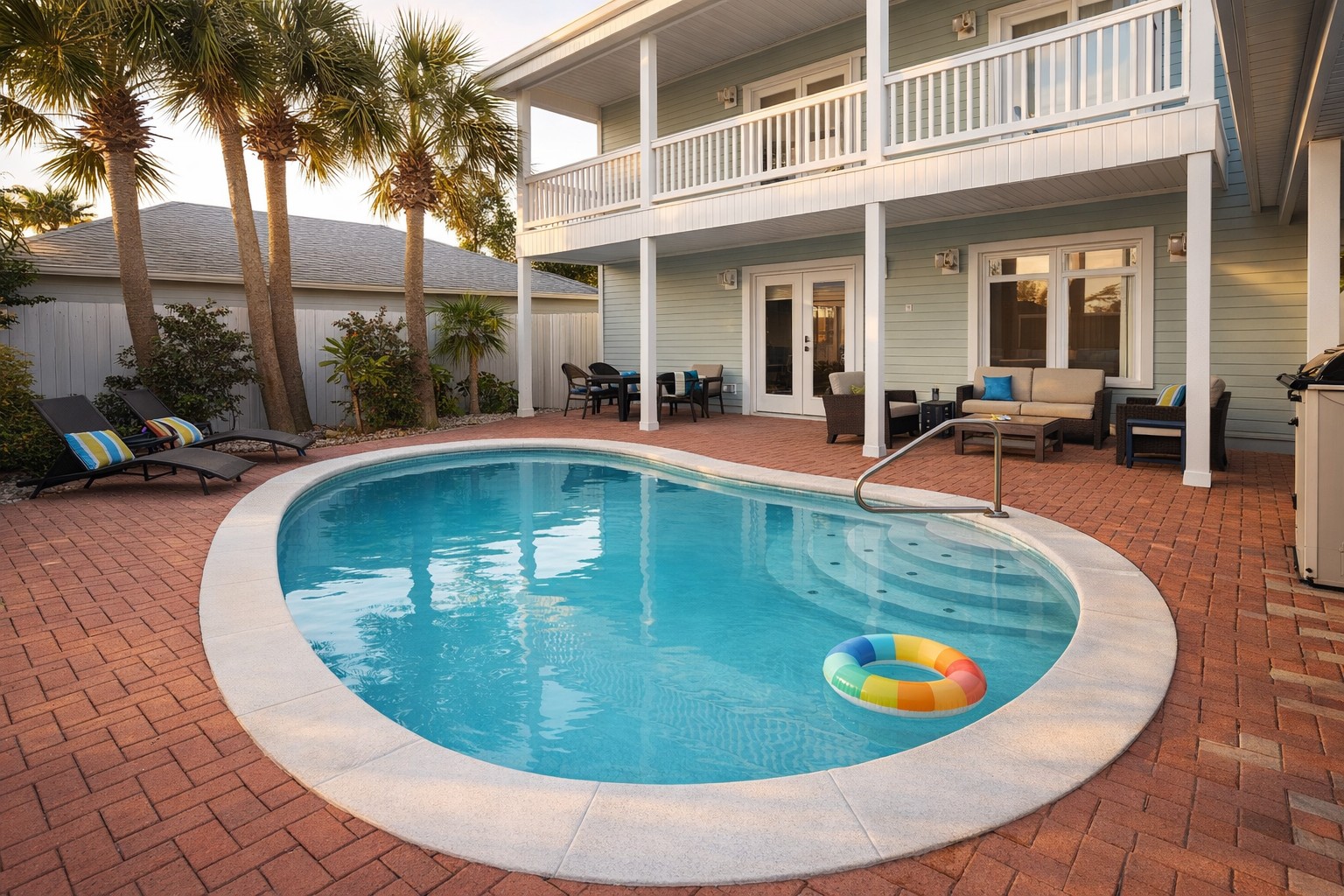 Backyard: The backyard is designed for easy outdoor living with a private pool, spacious brick patio, and covered lounge area perfect for relaxing in the shade. Start the day with coffee on the upstairs balcony, unwind on the poolside loungers, or enjoy casual meals and conversation in the outdoor dining area. Surrounded by palm trees and privacy fencing, this inviting space offers a peaceful setting for spending time together outside.