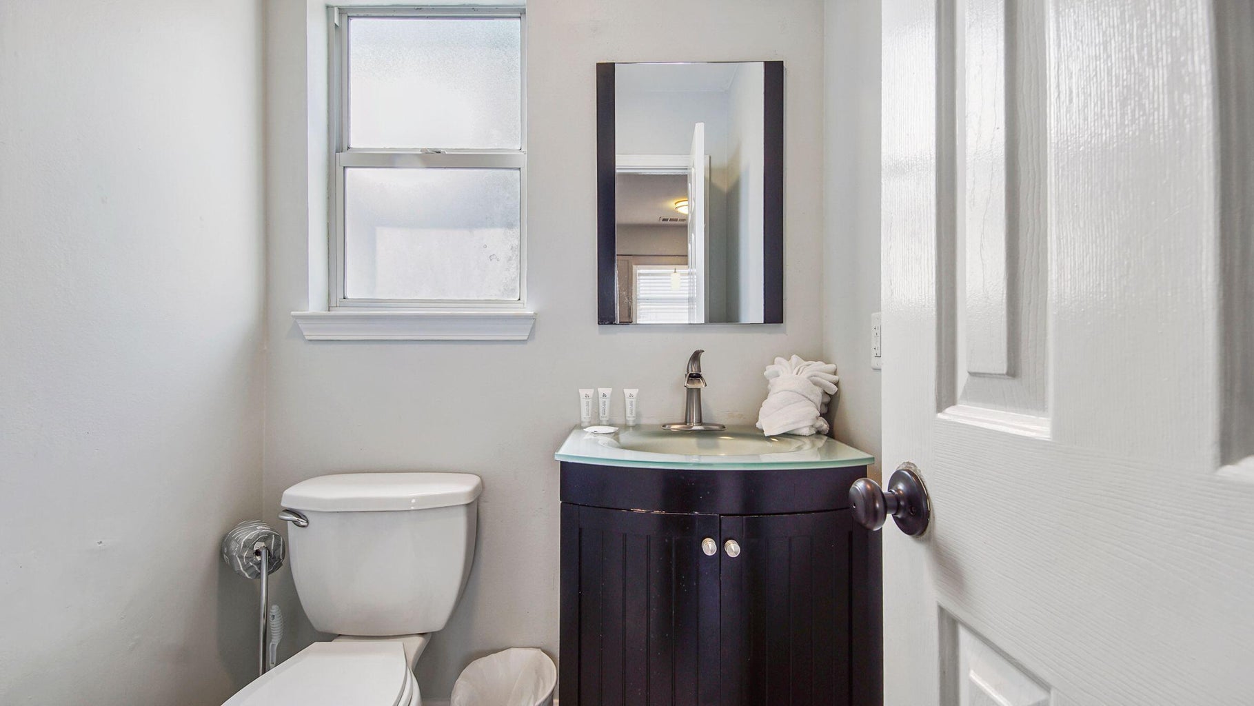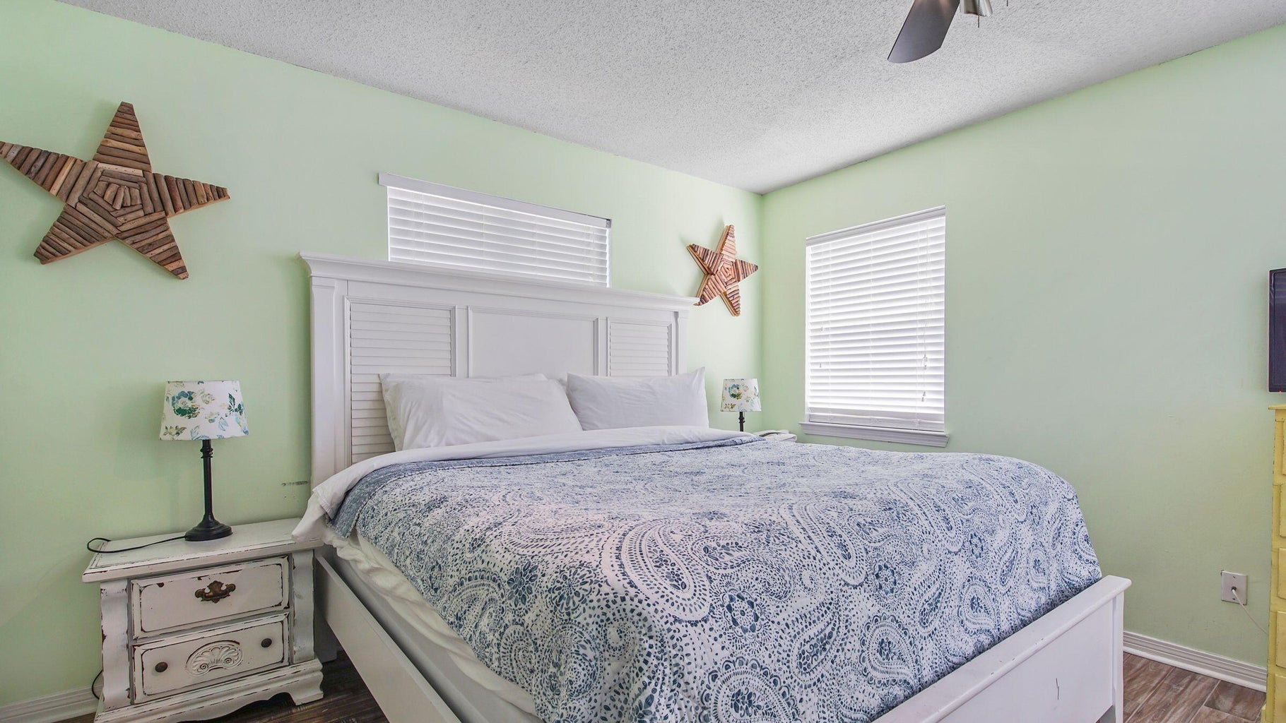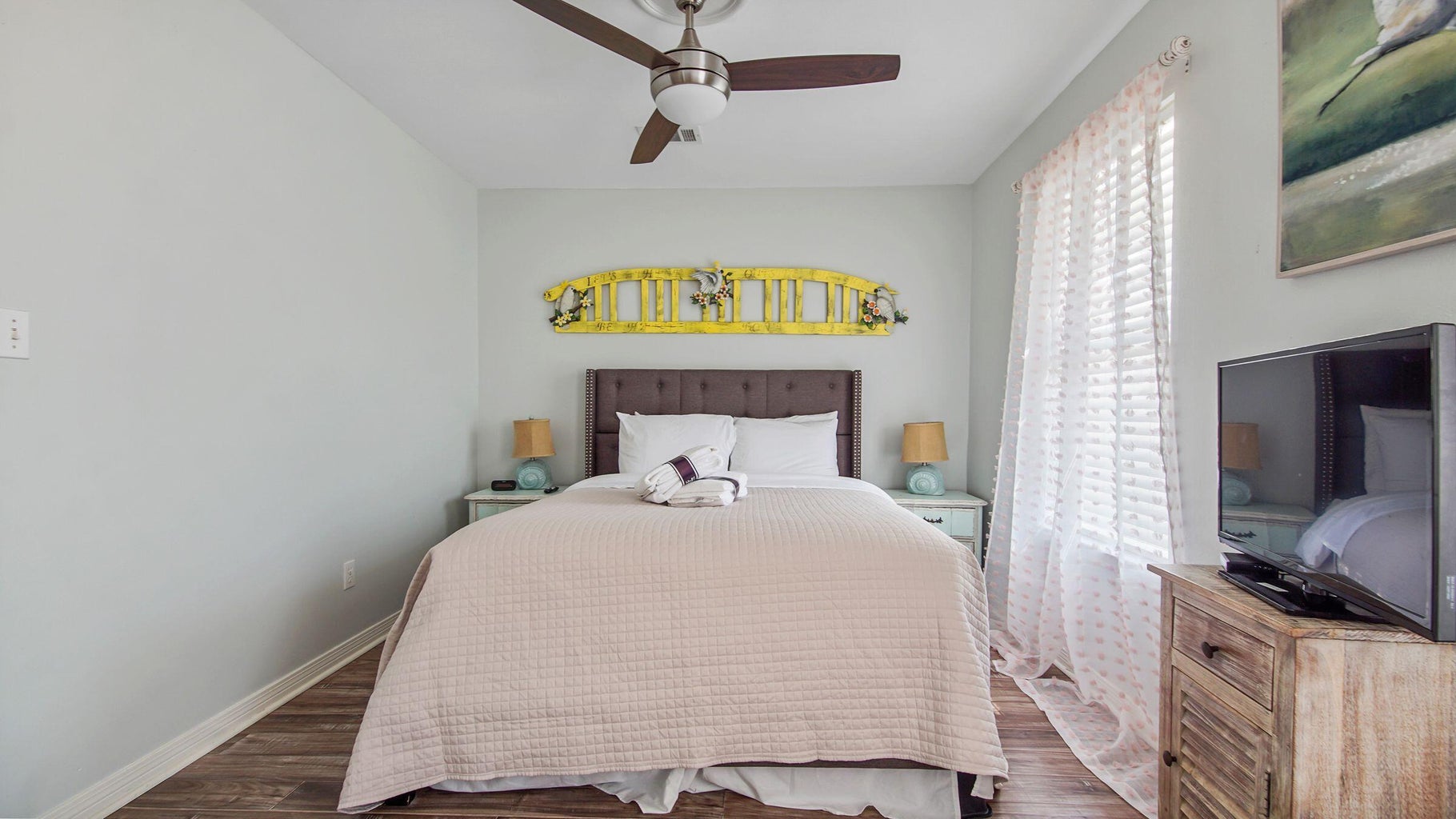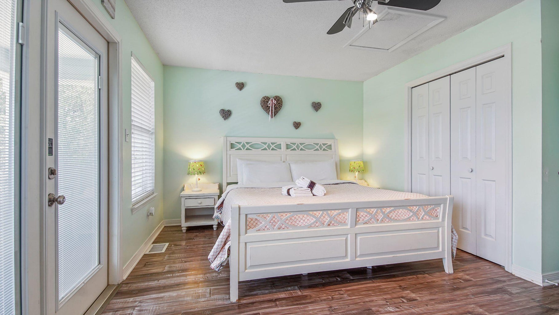 Master Bedroom: This bedroom includes a king-sized bed and a sleeper sofa, 2 nightstands, a dresser, and flat-screen TV. It has direct access to the private balcony overlooking the backyard. There is a private bathroom attached with a single vanity and shower/bathtub combination.