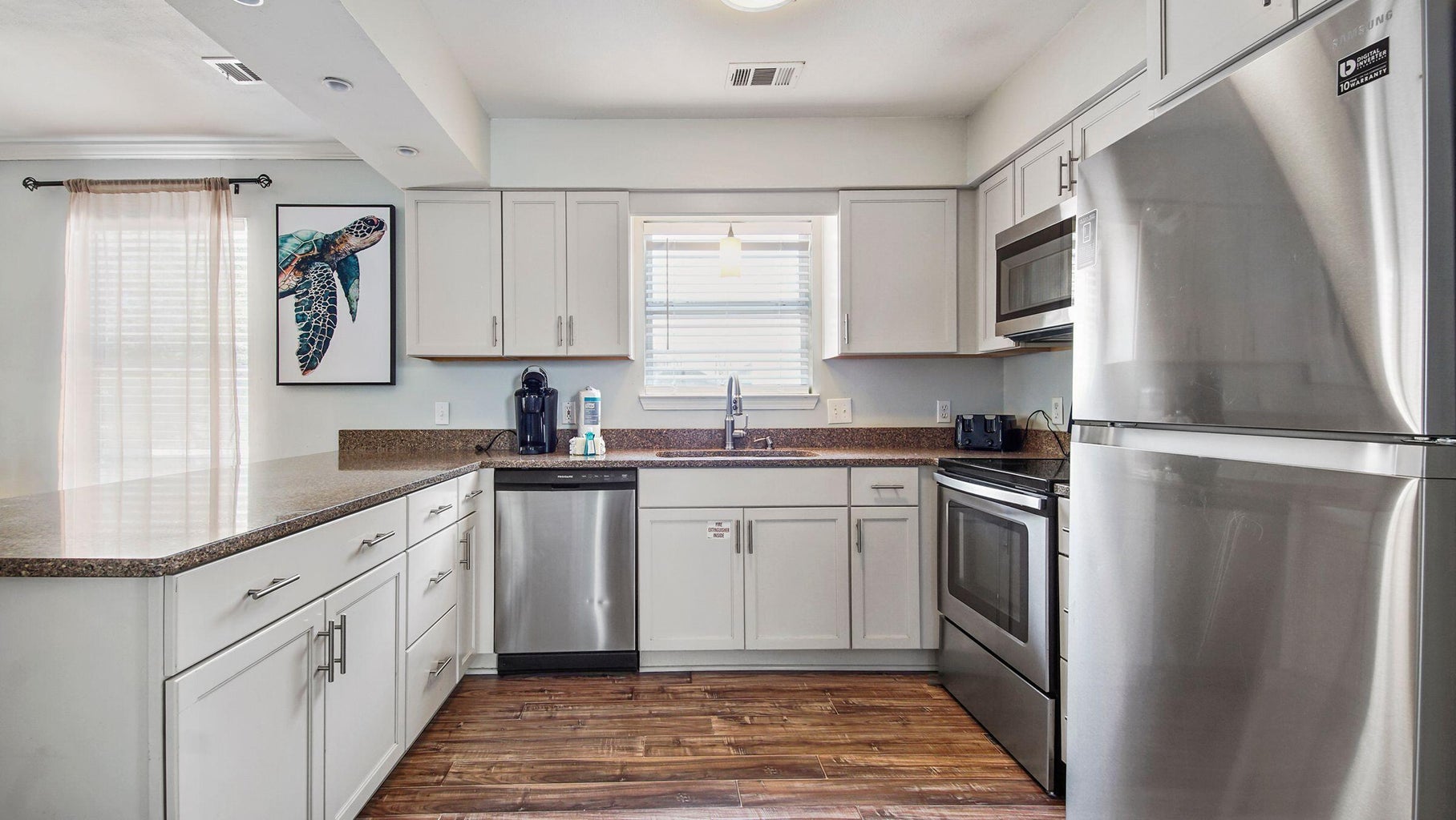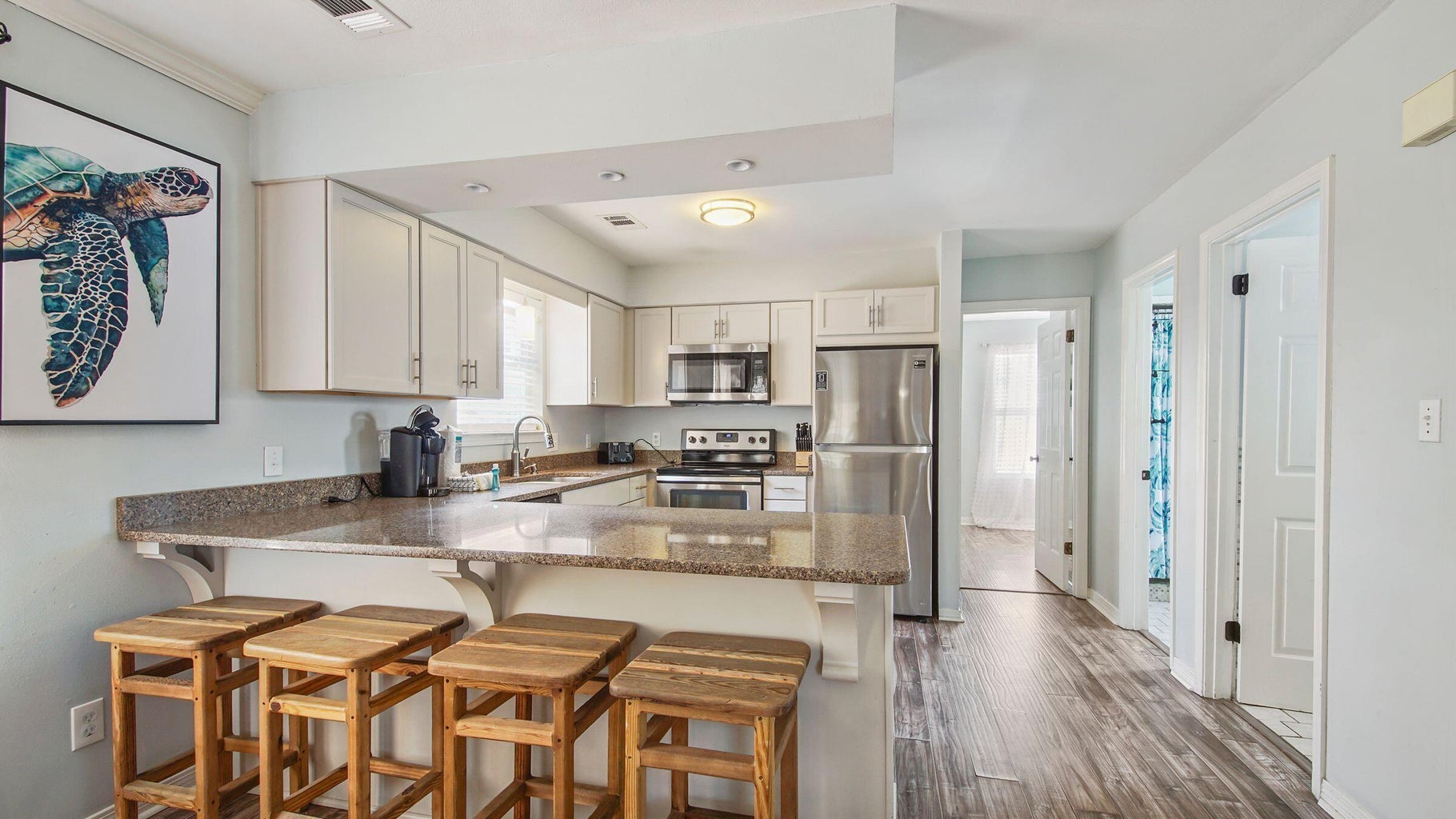 Kitchen: This bright kitchen features stainless steel appliances, ample cabinet storage, and spacious countertops for easy meal prep. The open layout includes a breakfast bar with seating for 4, making it perfect for casual dining and gathering. Fully equipped with essential cookware and modern conveniences, this kitchen is designed to make your stay comfortable and effortless.