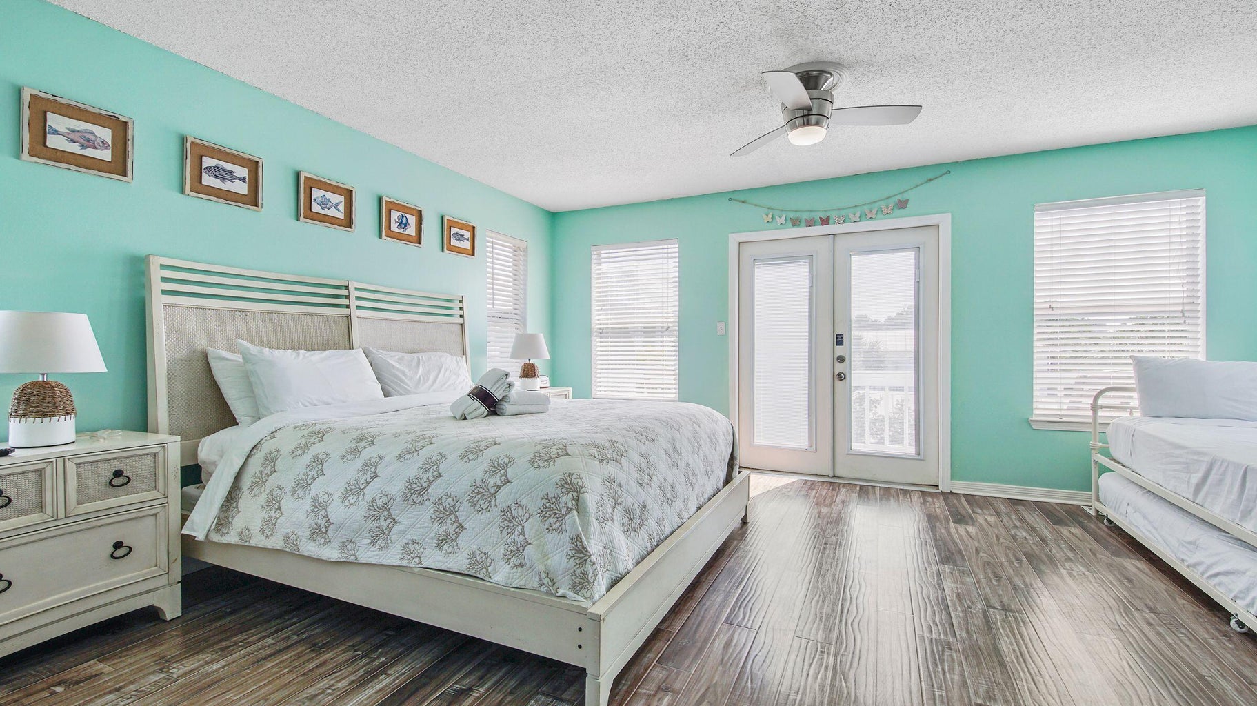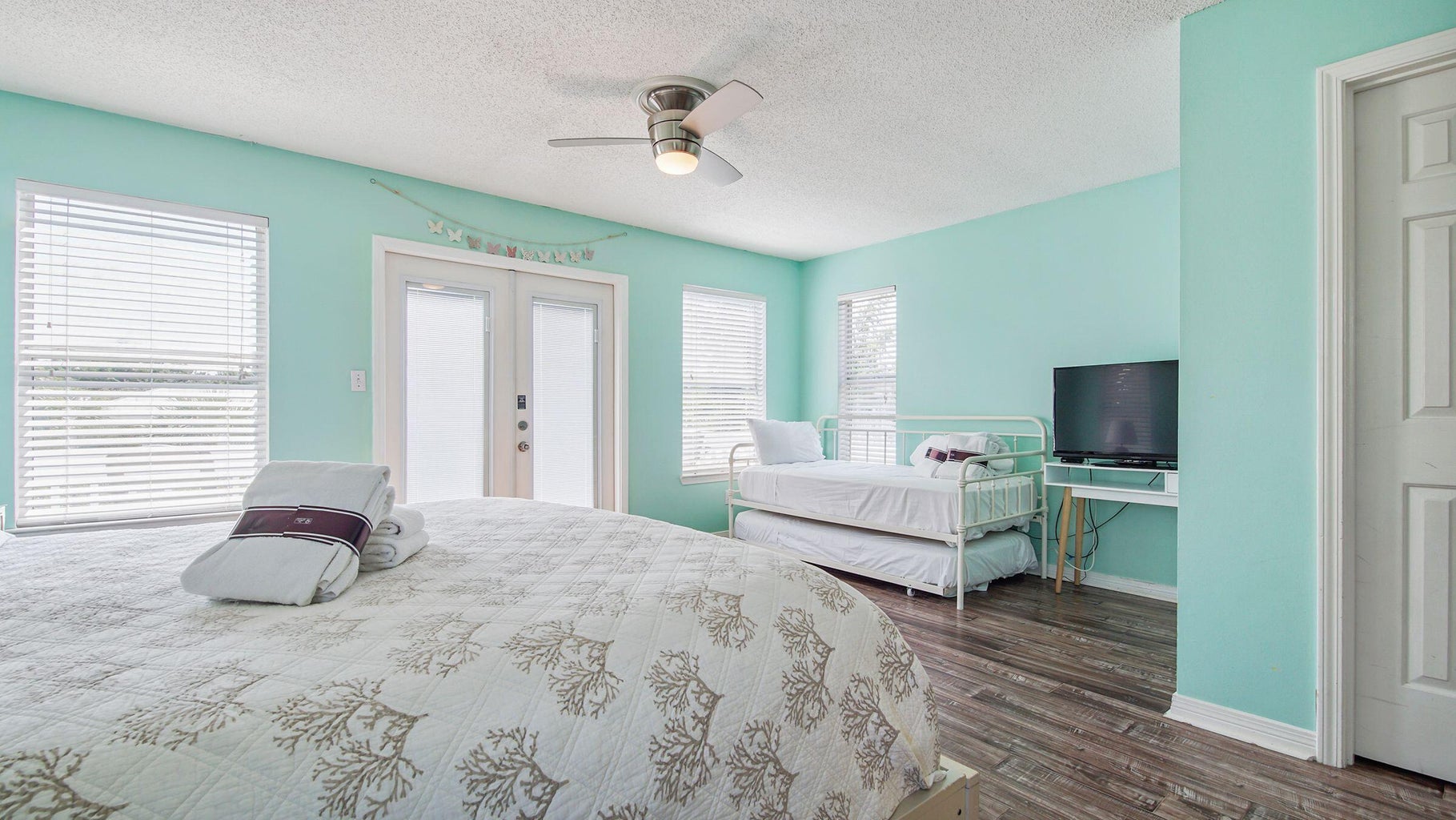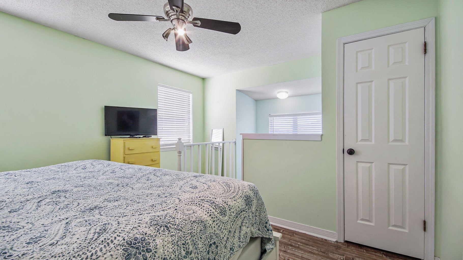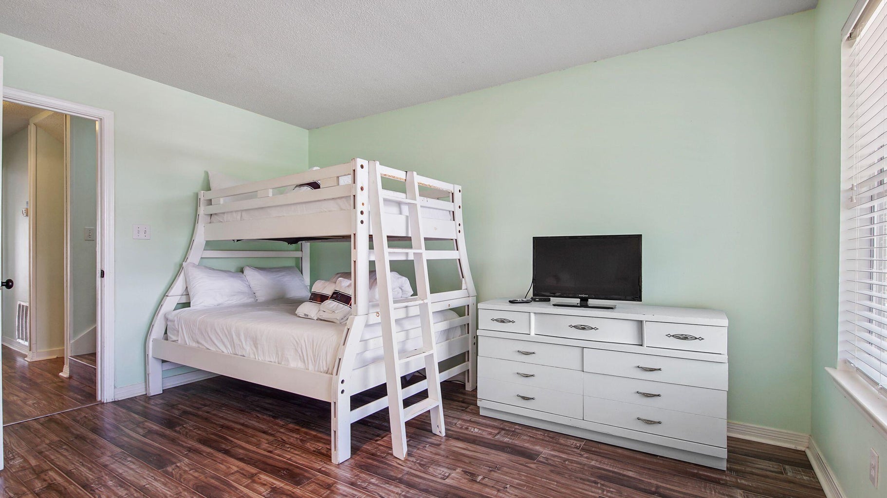 Guest Bedroom #2: This bedroom includes a king-sized bed and a twin/full bunk bed, 2 nightstands, a dresser, private closet, and flat-screen TV. It has direct access to the private balcony overlooking the front of the home. There is access to the 2nd floor hallway bathroom.