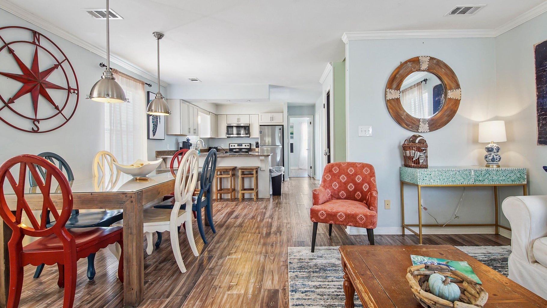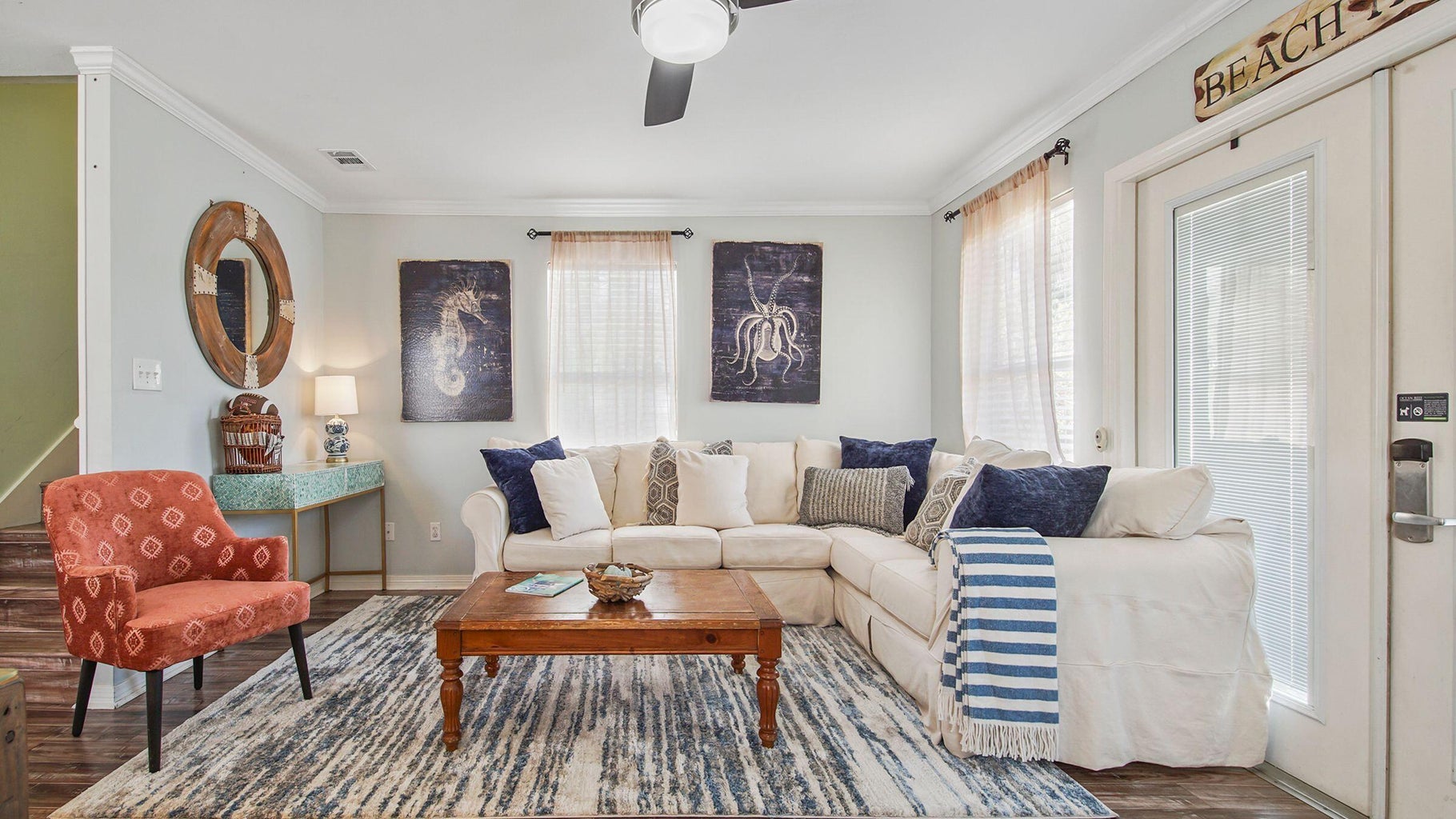 Living Room: This cozy living space offers comfortable seating with a plush sectional sofa, perfect for relaxing after a day at the beach. Large windows bring in natural light, while the open layout offers a seamless connection to the dining and kitchen areas.
