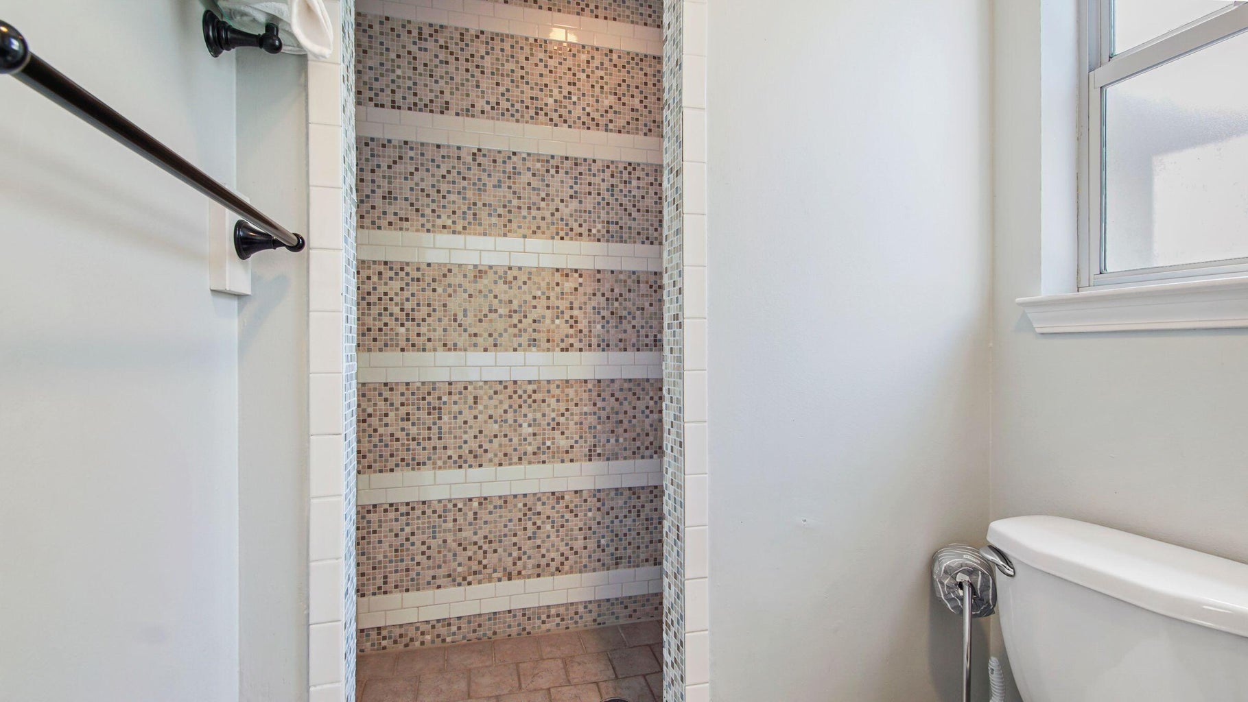 Guest Bathroom #1: This bathroom is right across from the kitchen before reaching Bedroom #1. It features a single vanity and spacious walk-in shower.