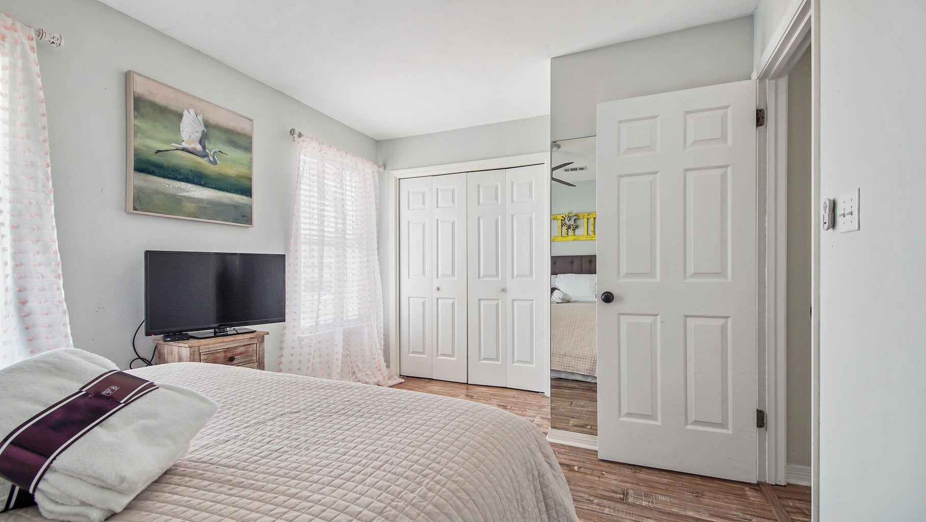Guest Bedroom #1: This bedroom includes a queen-sized bed, 2 nightstands, a dresser, private closet, and flat-screen TV. There is access to the 1st floor hallway bathroom.