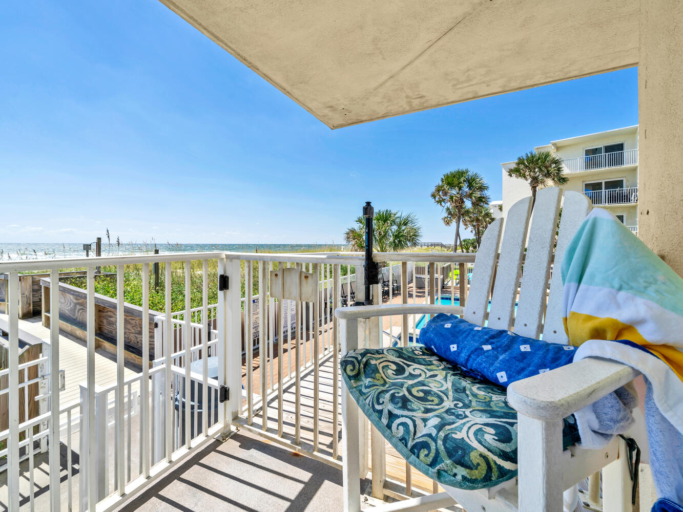 "We loved the closeness to the pool and the beach. Such a short walk to the beach! First floor was great visibility of the ocean and it was never impeded by the dunes. The amenities were as listed and it was nice to have many tools to cook. There were a couple minor issues that were fixed within a few hours or replacement offered. Loved the location for our older parents. Easy to navigate the steps to pool and very short walk to beach. Also had 2 toddlers and it felt very safe with such close access to pool. The closeness to pool was SO convenient with littles, and very visible from balcony so other members of family could watch them play. The towels were good quality and comfortable beds! Thank you!"