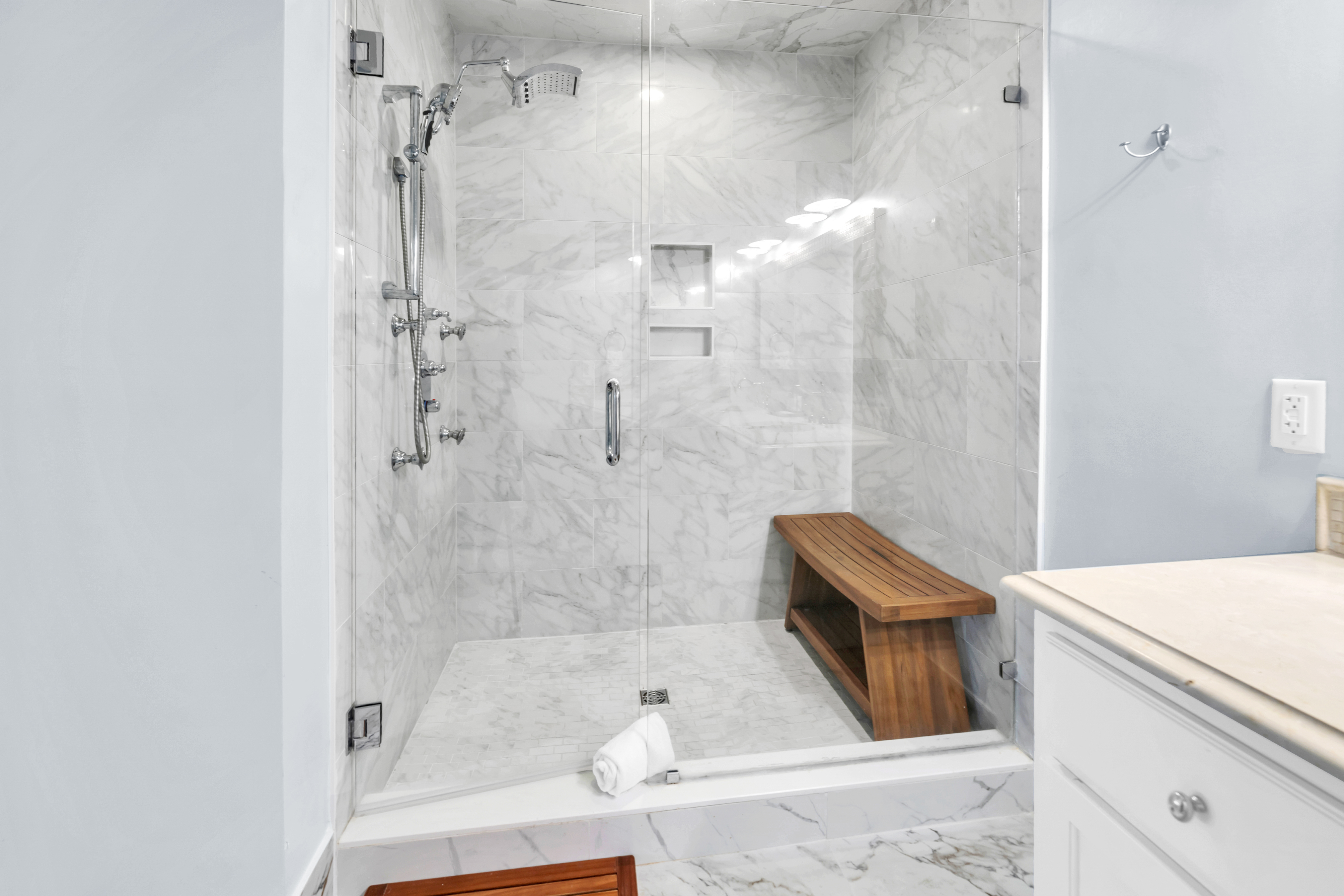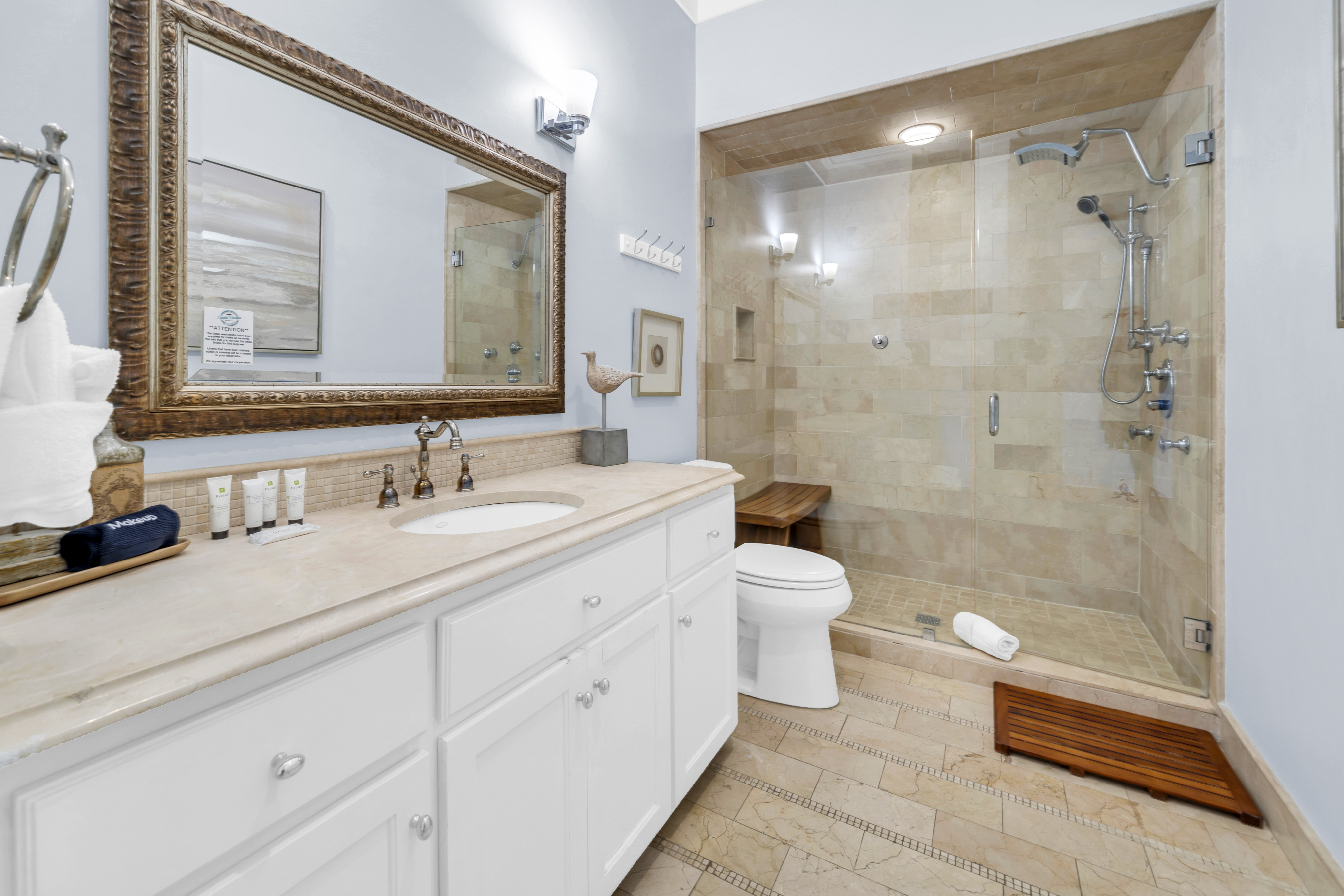 Master Bedroom #1: This bedroom includes a king-sized bed, 2 nightstands, a dresser, 2 private closets, and a flat-screen TV. It has direct access to the private balcony. There is a private bathroom attached with a single vanity and spacious walk-in shower.