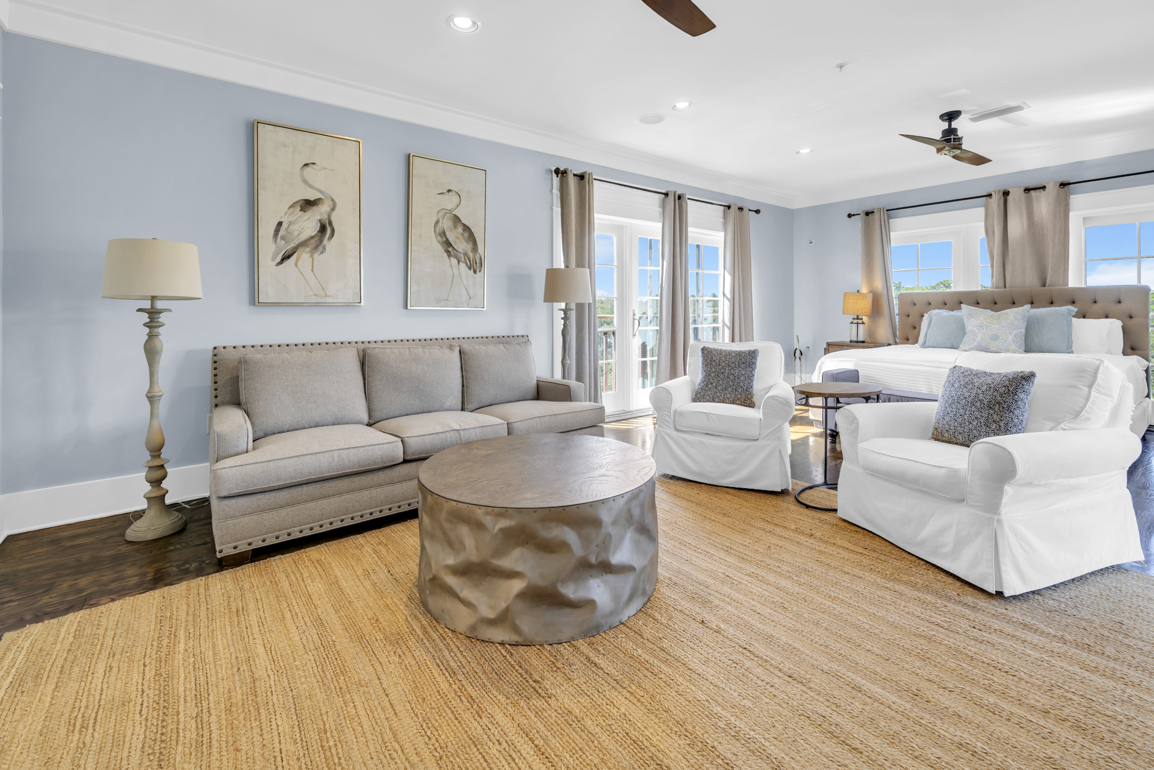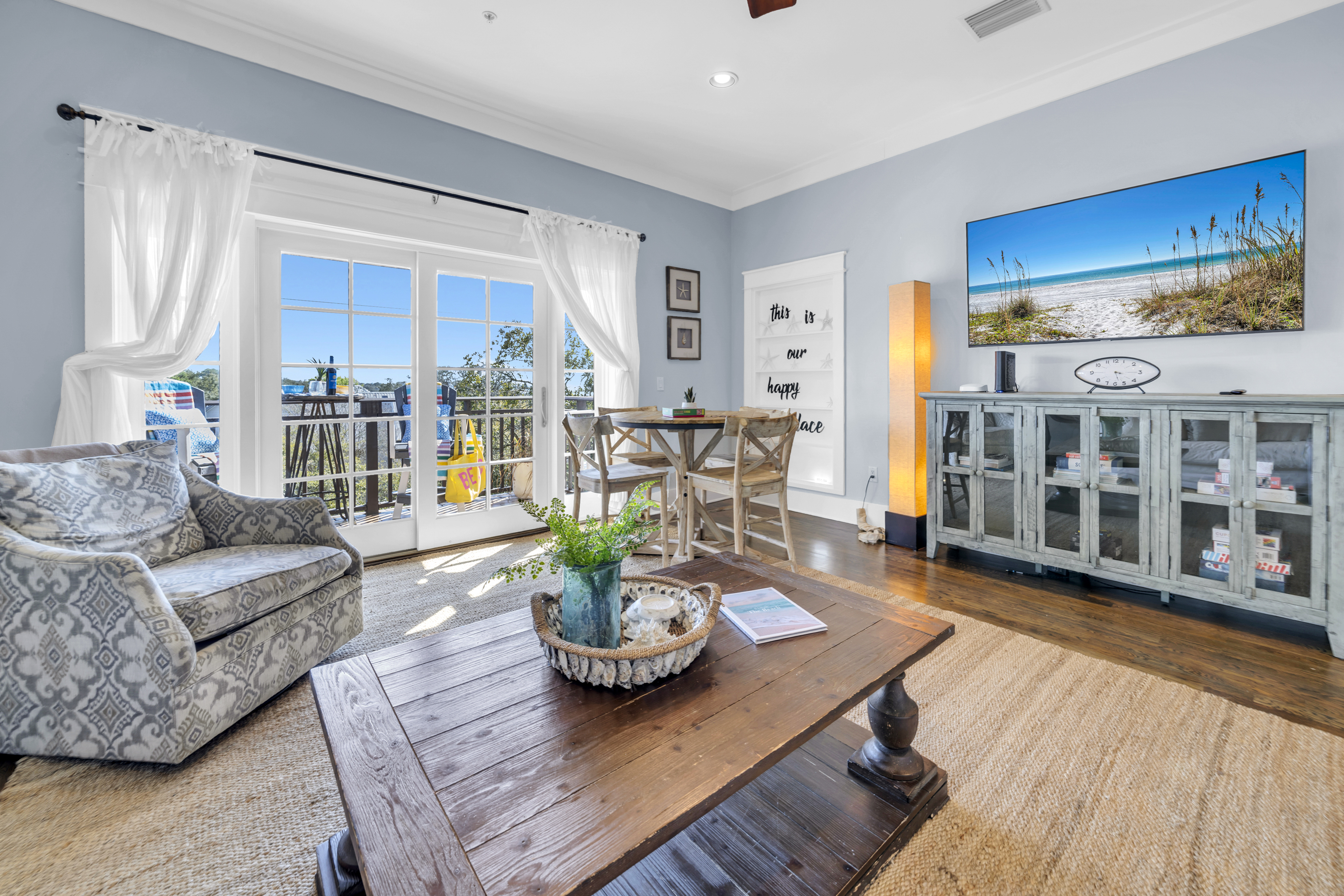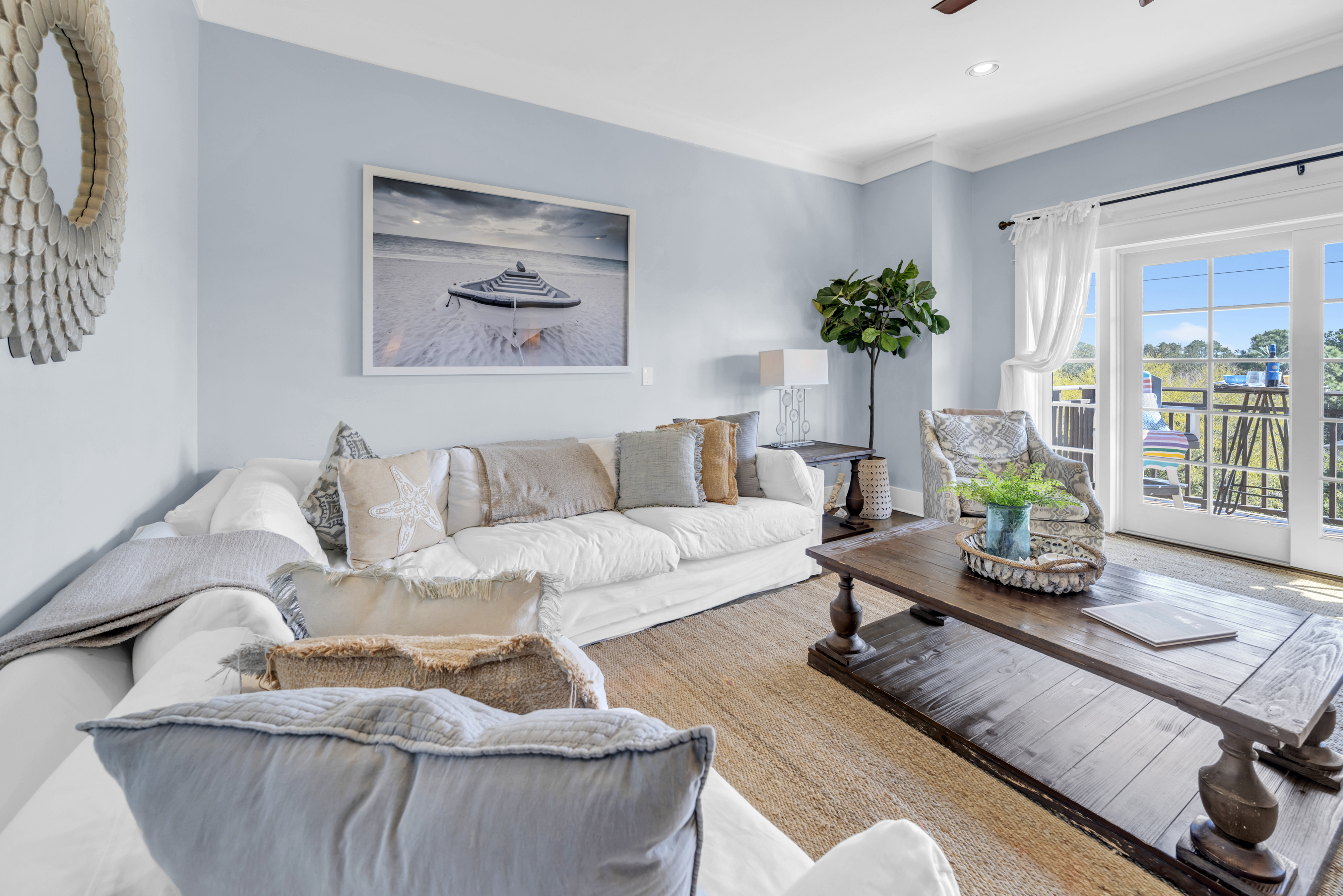 Living Room: The bright and comfortable living room features a plush sectional, cozy seating, and coastal inspired décor. French doors fill the space with natural light and open to a private balcony, creating the perfect place to relax after a day at the beach.