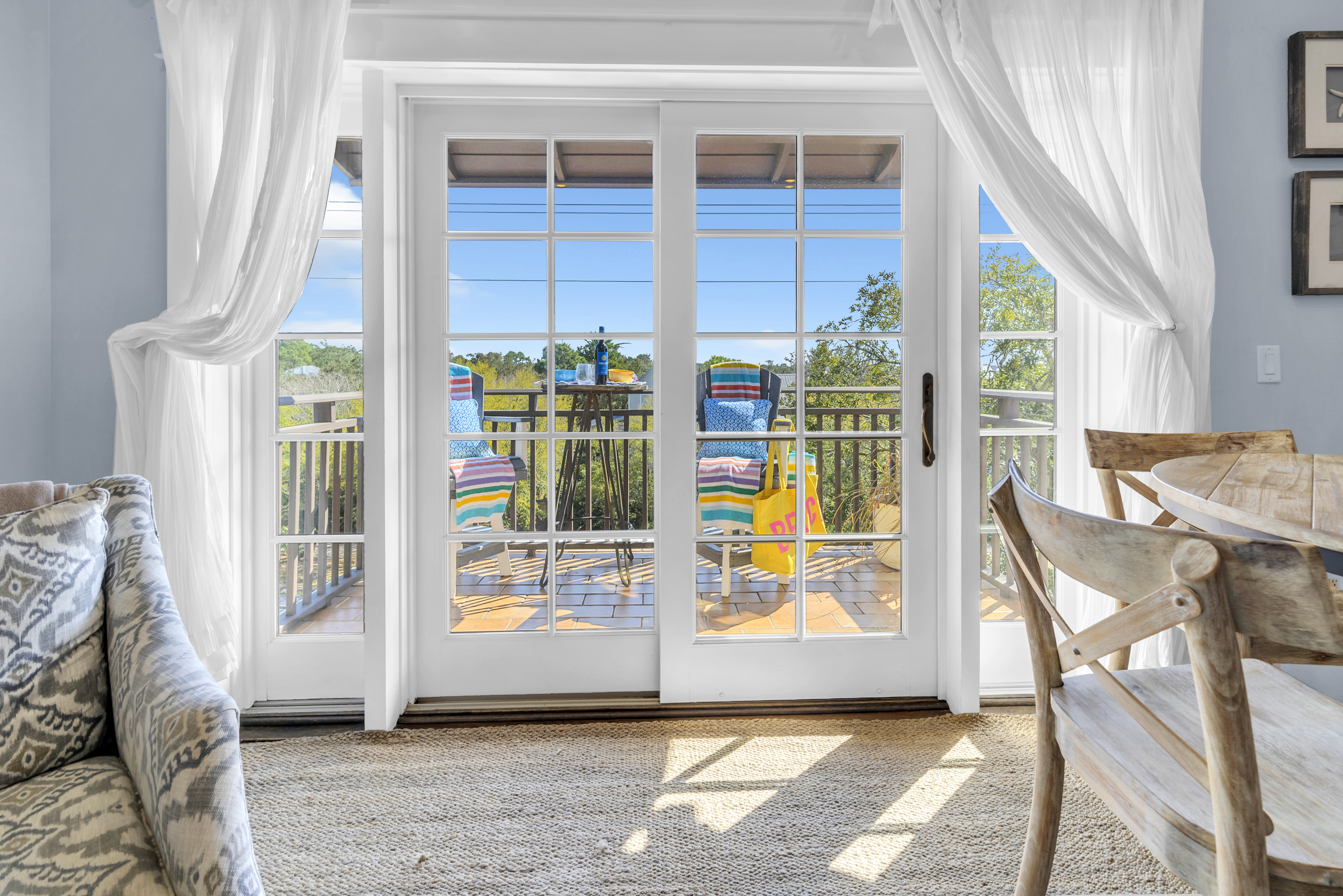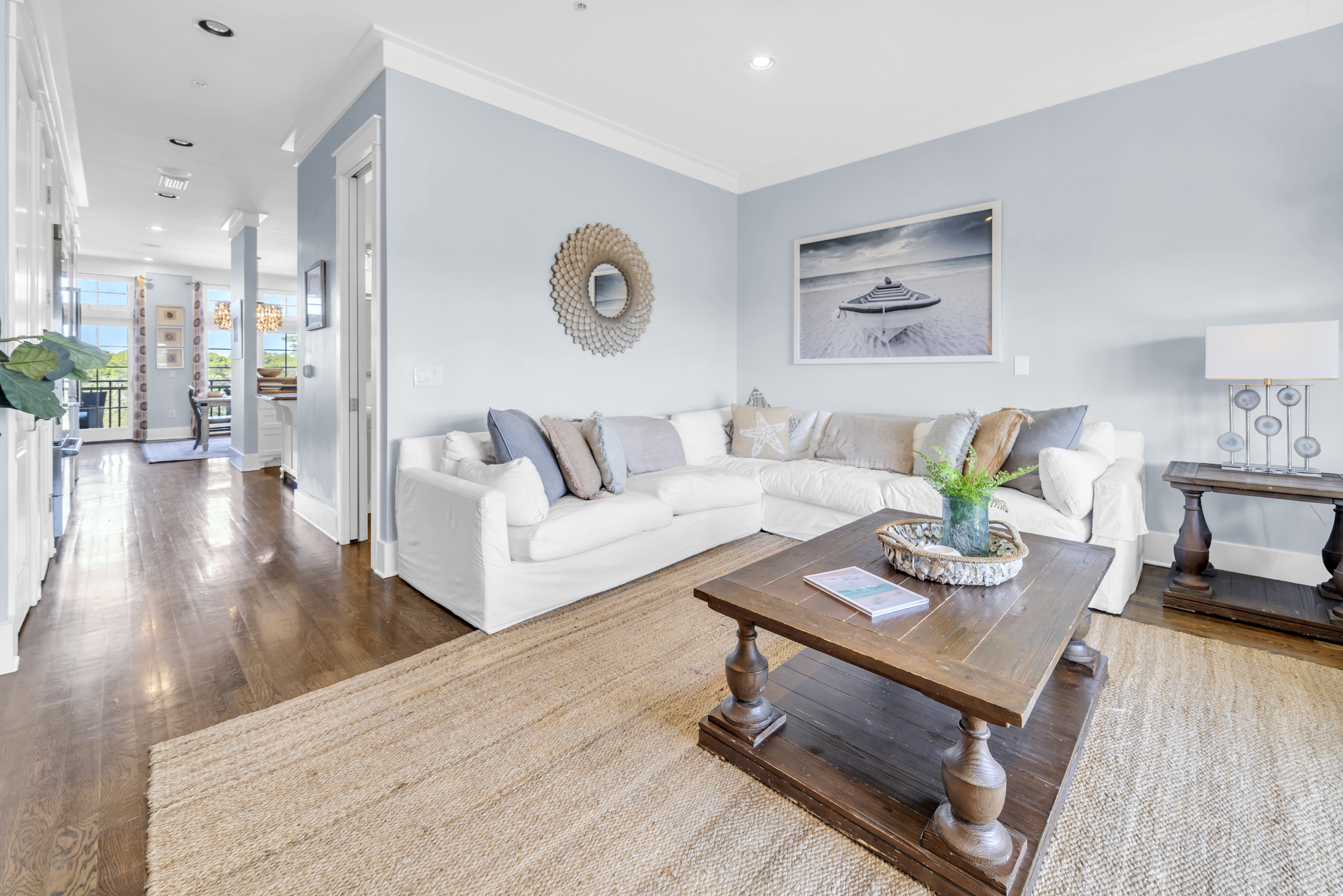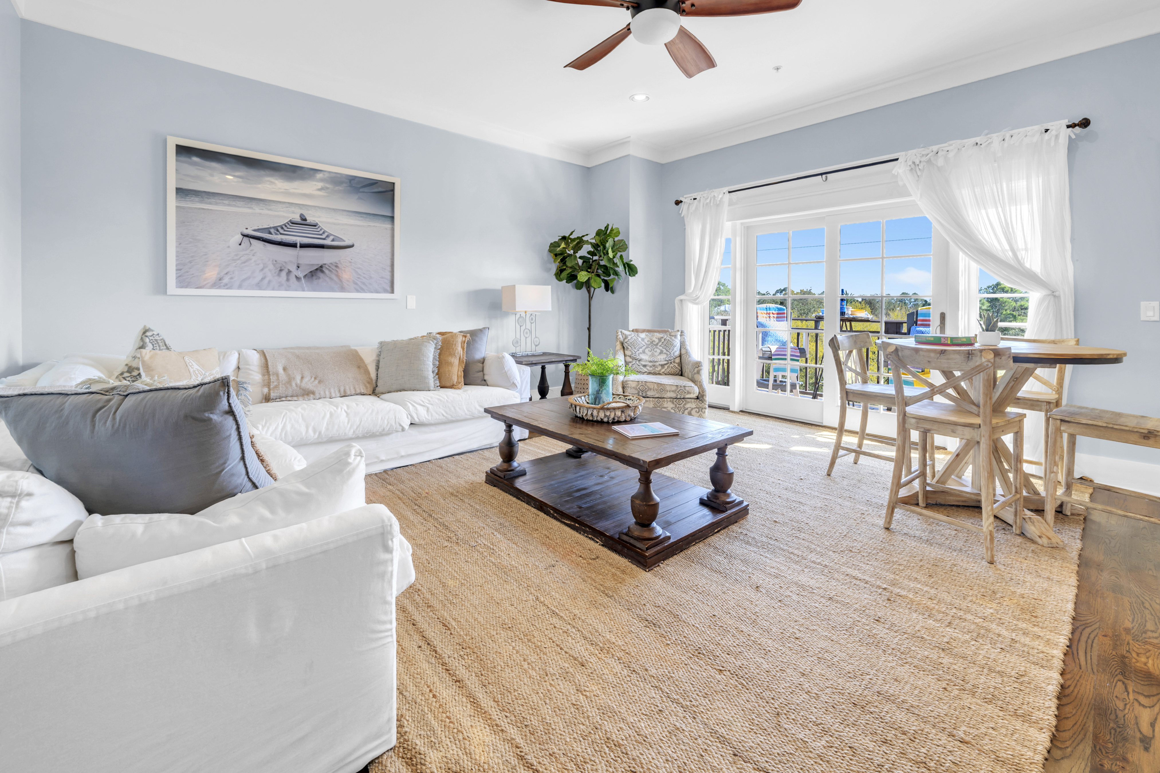 Living Room: The bright and comfortable living room features a plush sectional, cozy seating, and coastal inspired décor. French doors fill the space with natural light and open to a private balcony, creating the perfect place to relax after a day at the beach.