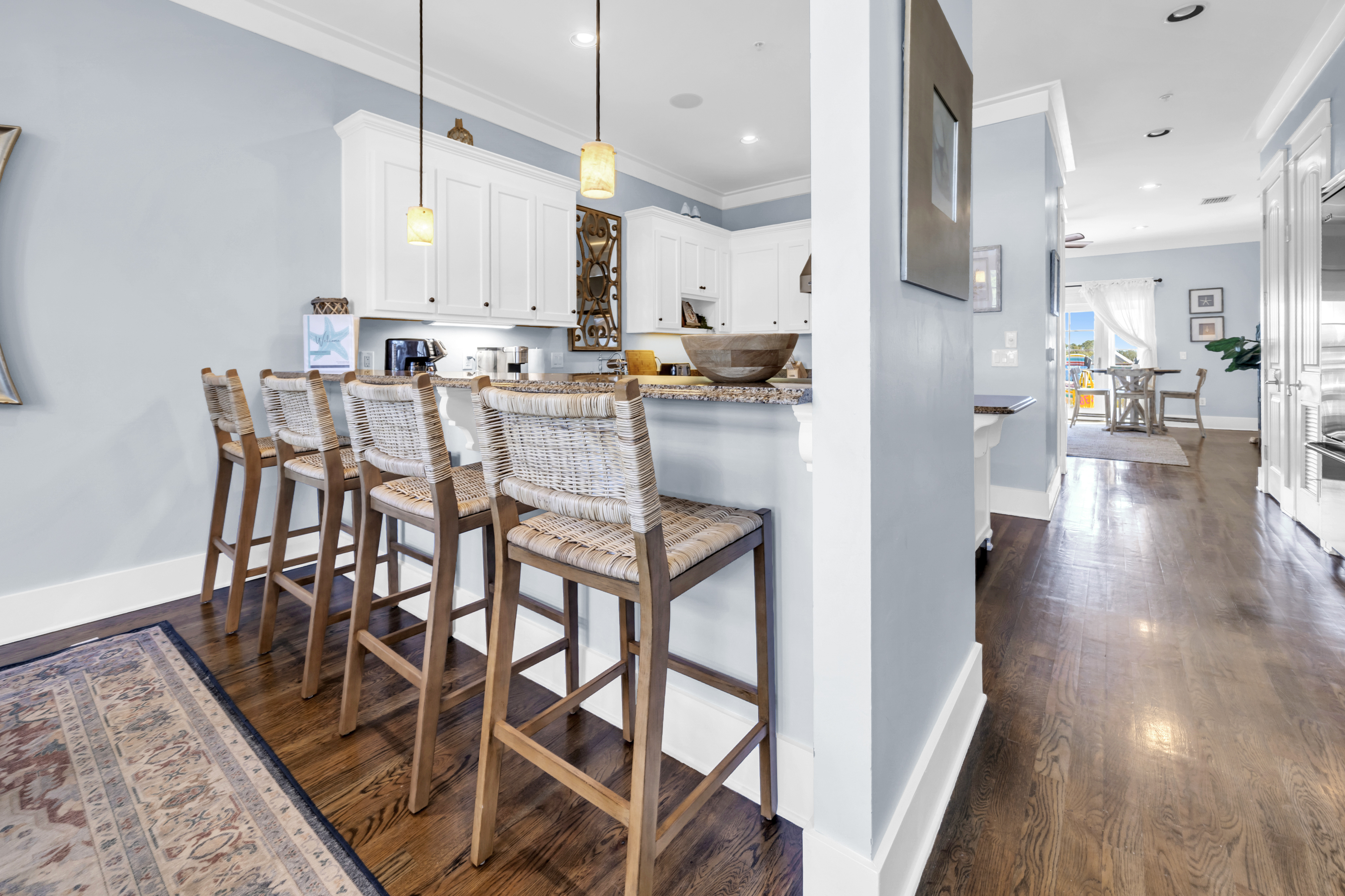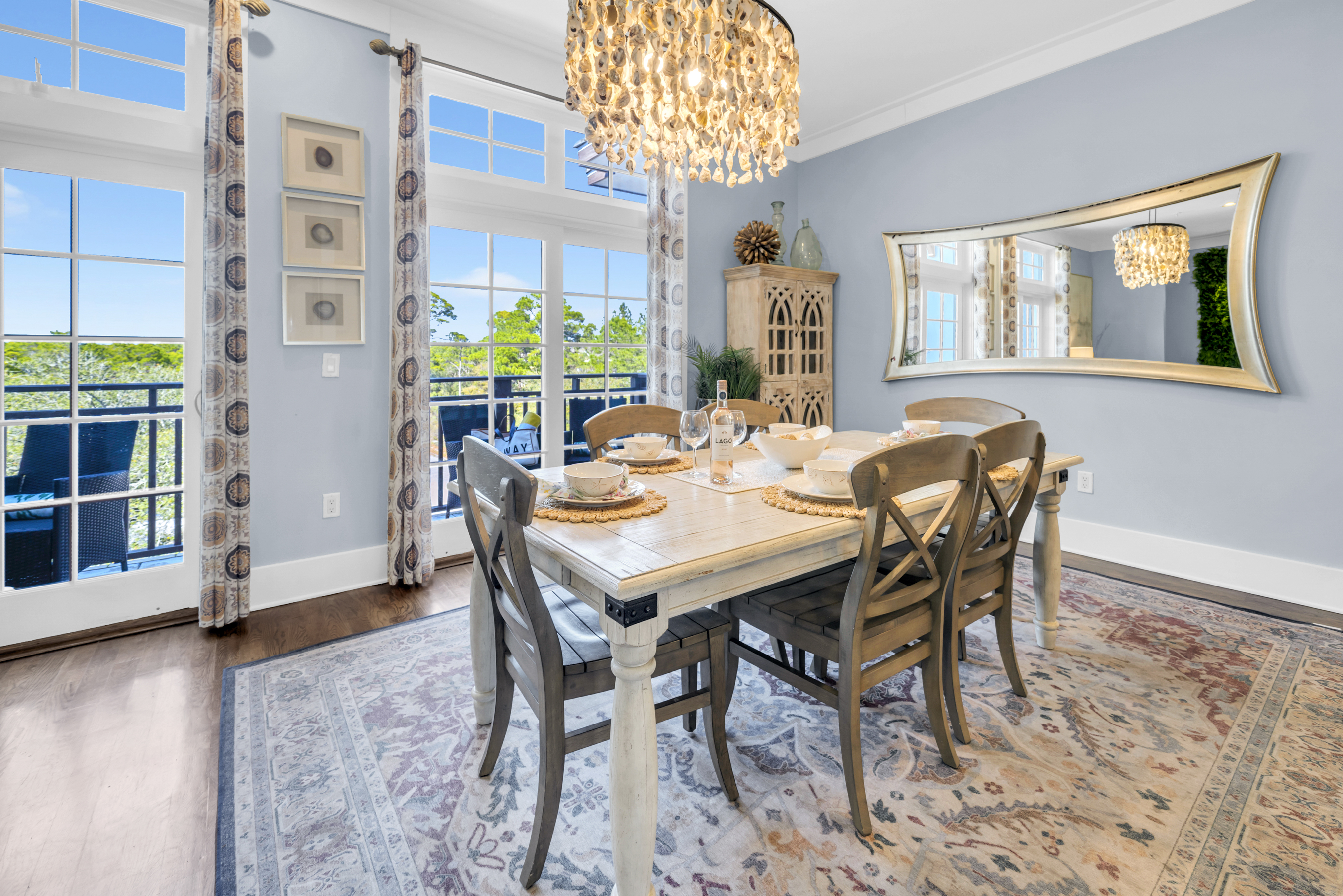 Dining Room: The dining area features a spacious wooden table with seating for 8, perfect for shared meals and gathering together. A beautiful shell chandelier above the table adds a warm coastal touch to the space.