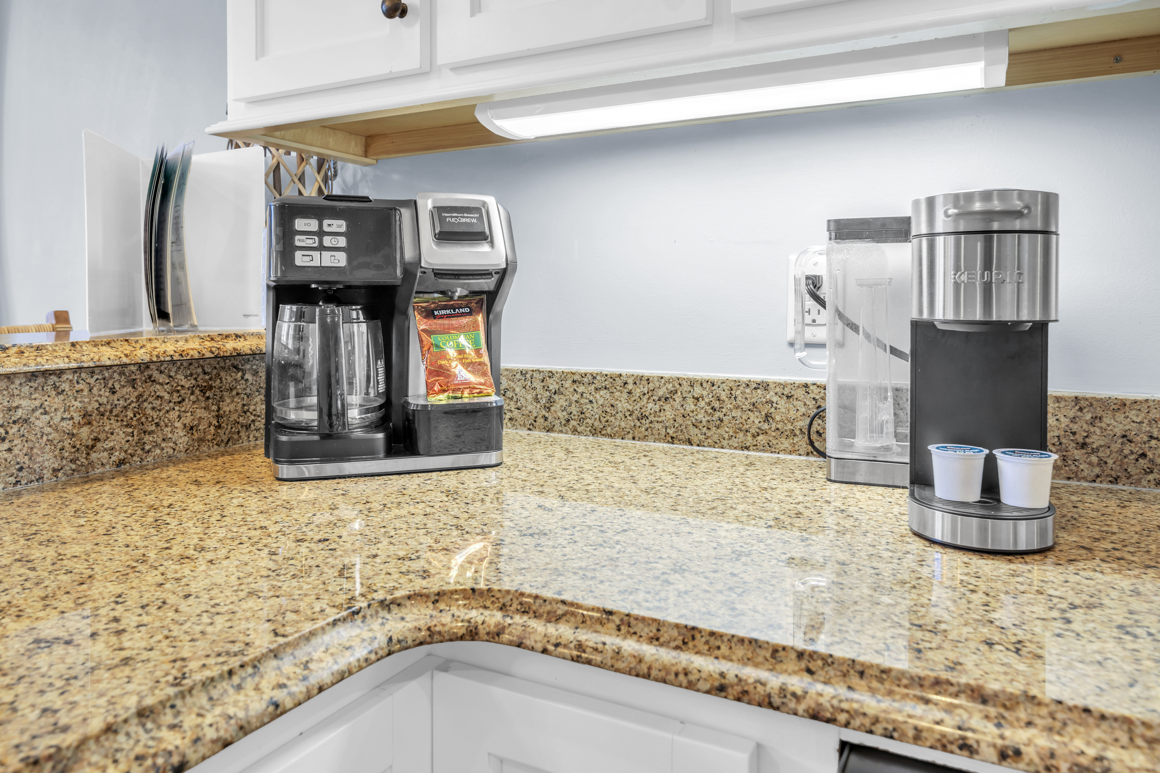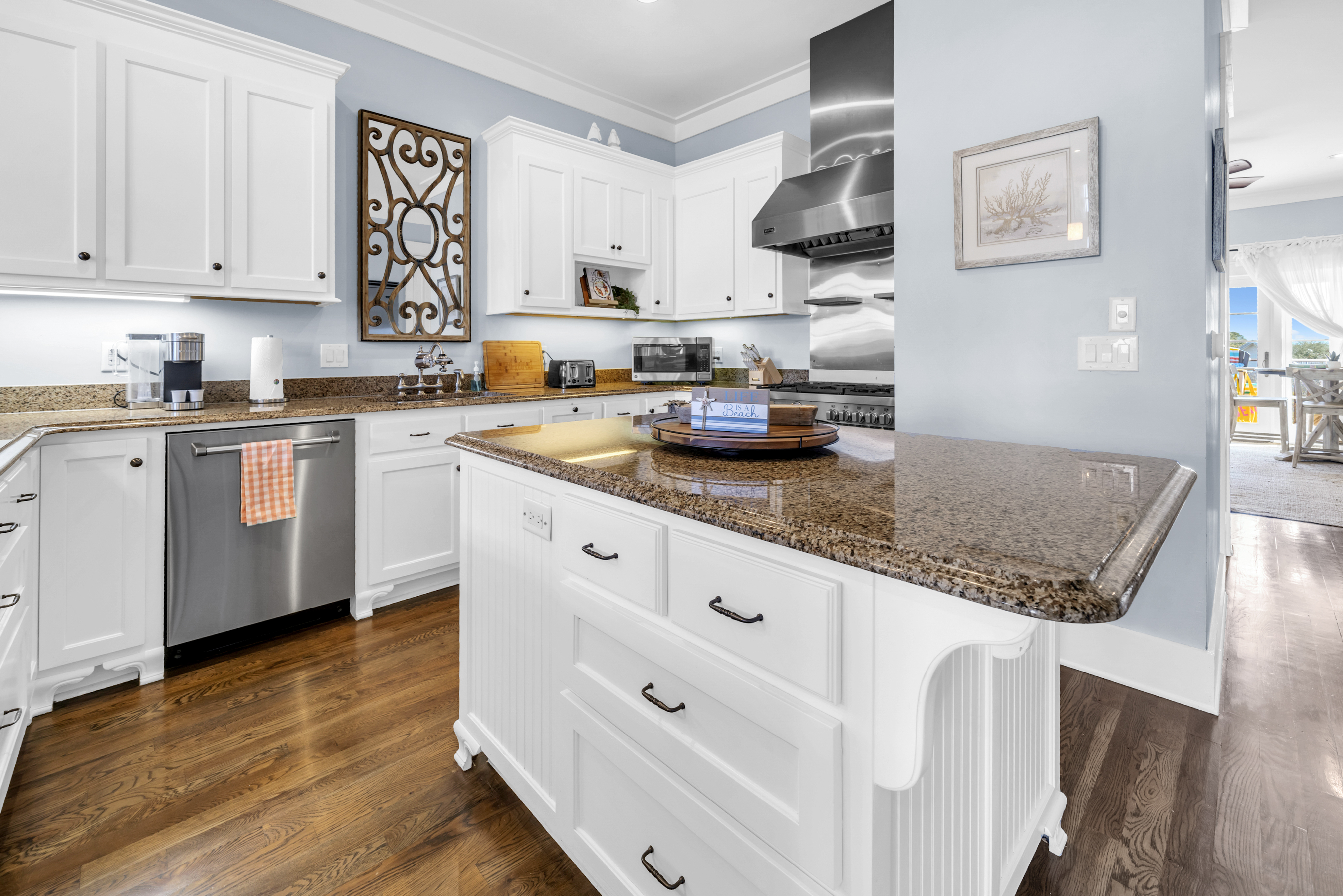 Kitchen: The fully equipped kitchen features granite countertops, stainless steel appliances, and a large island with plenty of prep space. Amenities include a refrigerator, stove, oven, microwave, dishwasher, coffee maker, toaster, and all the cookware and essentials needed to prepare meals during your stay. A breakfast bar with seating for 4 offers the ideal spot for casual meals or morning coffee.